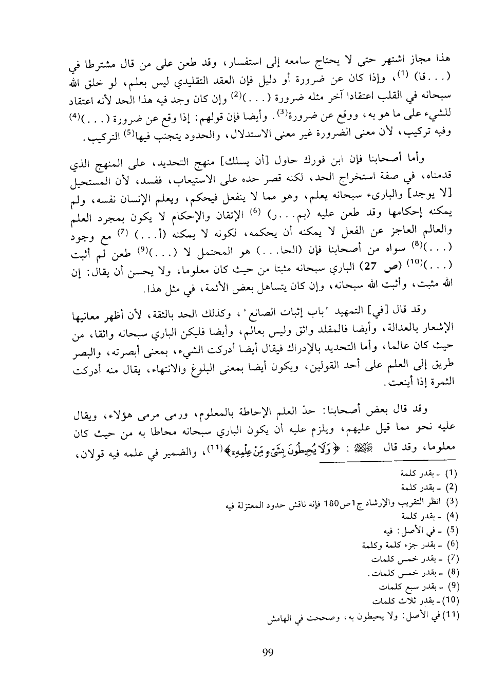 وأما أصحابنا فإن ابن فورك حاول [أن يسلك] منهج التحديد، على المنهج الذي قدمناه، في صفة استخراج الحد، لكنه قصر حده على الاستيعاب، ففسد، لأن المستعجل [لا يوجد] والبارئ سبحانه يعلم، وهو مما لا ينفعل فيحكم، ويعلم الإنسان نفسه، ولم يمكنه إحكامها وقد طعن عليه (بم ... ر) الإتقان والإحكام لا يكون بمجرد العلم والعالم العاجز عن الفعل لا يمكنه أن يحكمه، لكونه لا يمكنه (أ ...) مع وجود (...) سواه من أصحابنا فإن (الحا ...) هو المحتمل لا (...) طعن لم أثبت (...) (ص ٢٧) الباري سحبانه مثبتا من حيث كان معلوما، ولا يحسن أن يقال: إن الله مثبت، وأثبت الله سبحانه، وإن كان يتساهل بعض الأئمة، في مثل هذا.
