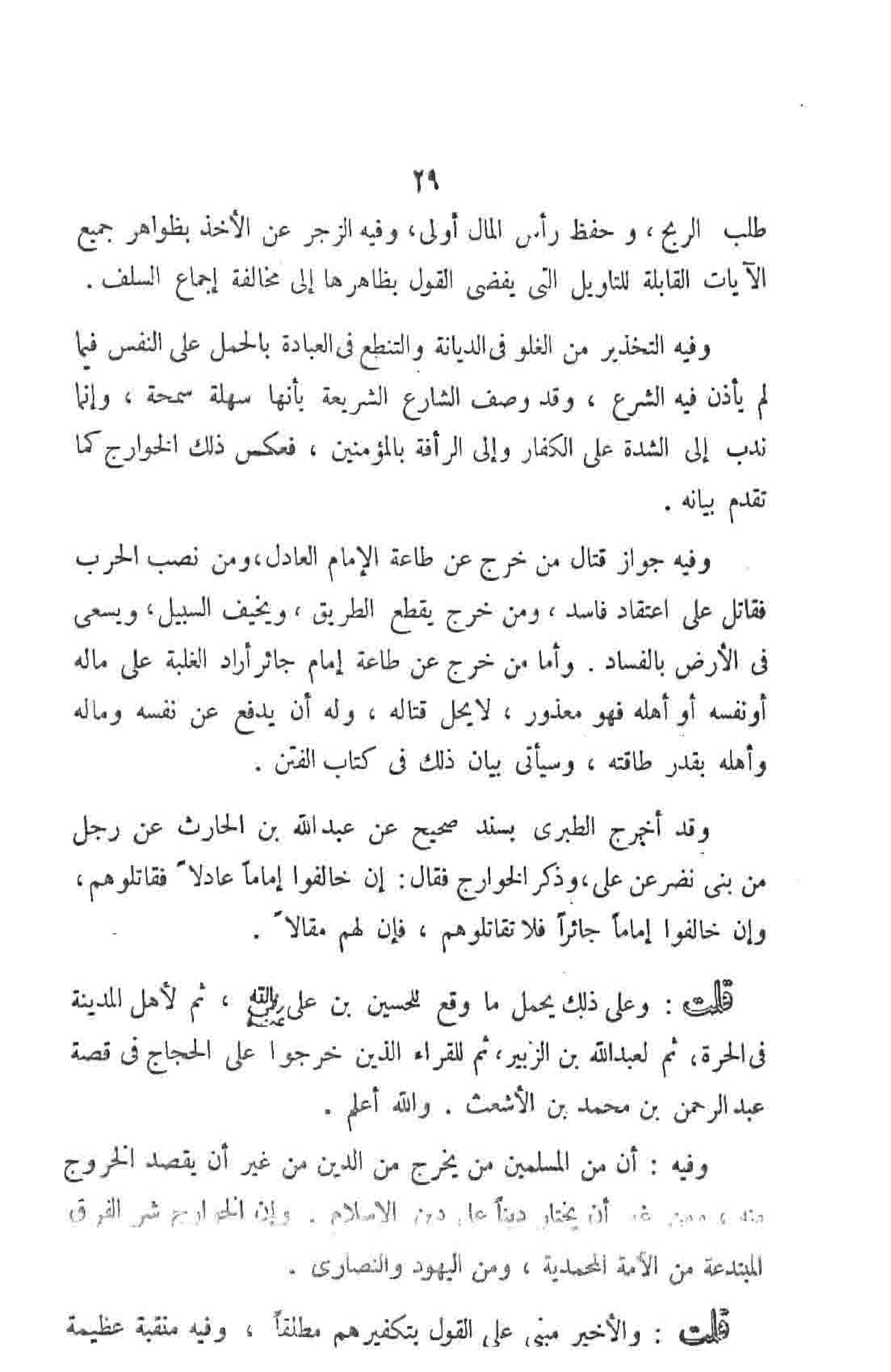 وقد أخرج الطبري بسند صحيح عن عبد الله بن الحارث عن رجل من بني نضر عن علي، وذكر الخوارج فقال: إن خالفوا إماماً عادلاً فقاتلوهم، وإن خالفوا إماماً جائراً فلا تقاتلوهم، فإن لهم مقالاً.