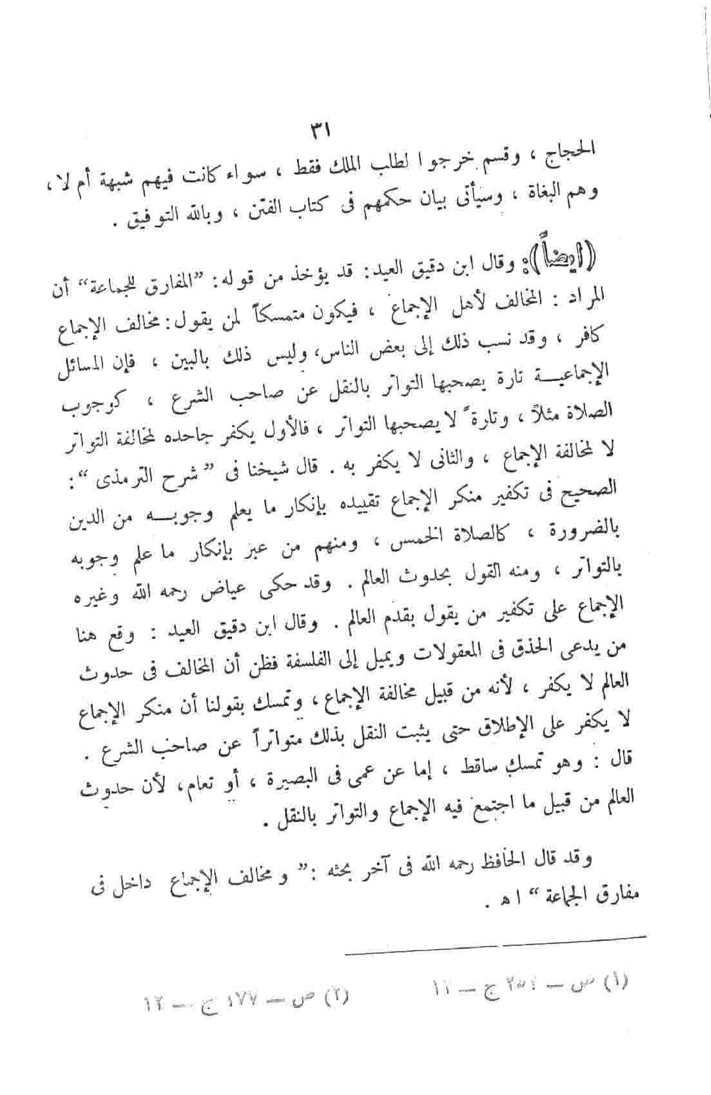(أيضاً) : وقال ابن دقيق العيد: قد يؤخذ من قوله: "المفارق للجماعة" أن المراد: المخالف لأهل الإجماع، فيكون متمسكاً لمن يقول: مخالف الإجماع كافر، وقد نسب ذلك إلى بعض الناس، وليس ذلك بالبين، فإن المسائل الإجماعية تارة يصحبها التواتر بالنقل عن صاحب الشرع، كوجوب الصلاة مثلاً، وتارة لا يصحبها التواتر، فالأول يكفر جاحده لمخالفة التواتر لا لمخالفة الإجماع، والثاني لا يكفر به. قال شيخنا في "شرح الترمذي": الصحيح في تكفير منكر الإجماع تقييده بإنكار ما يعلم وجوبه من الدين بالضرورة، كالصلاة الخمس، ومنهم من عبر بإنكار ما علم وجوبه بالتواتر، ومنه القول بحديث العالم. وقد حكى عياض رحمة الله وغيره الإجماع على تكفير من يقول بقدم العالم. وقال ابن دقيق العيد: وقع هنا من يدعي الحذق في المعقولات ويميل إلى الفلسفة فظن أن المخالف في حدوث العالم لا يكفر، لأنه من قبيل مخالفة الإجماع، وتمسك بقولنا أن منكر الإجماع لا يكفر على الإطلاق حتى يثبت النقل بذلك متواتراً عن صاحب الشرع. قال: وهو تمسك ساقط، إما عن عمي في البصيرة، أو تعام، لأن حدوث العالم من قبيل ما اجتمع فيه الإجماع والتواتر بالنقل.