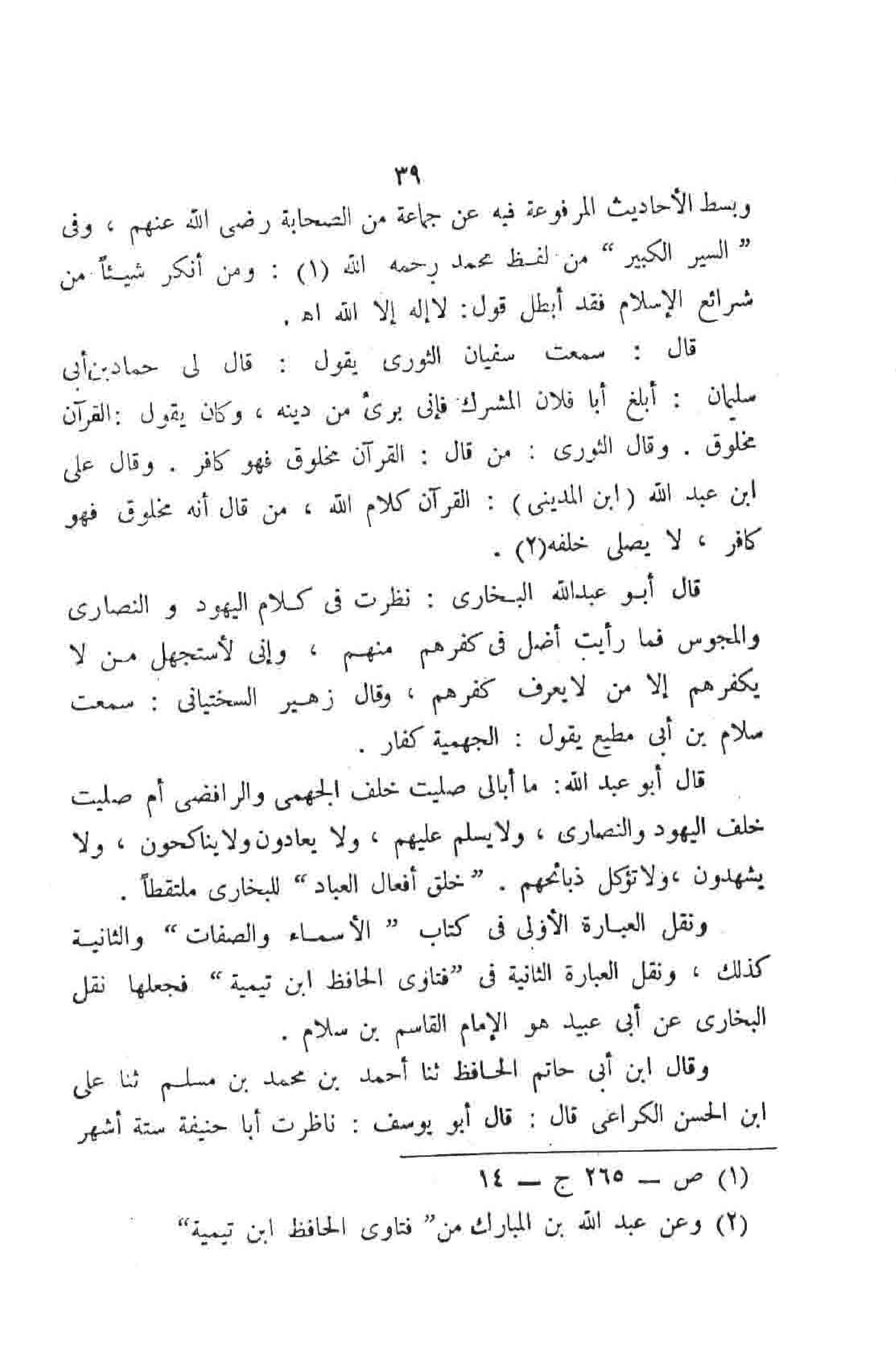 قال: سمعت سفيان الثوري يقول: قال لي حماد بن أبي سليمان: أبلغ أبا فلان المشرك فإني بريء من دينه، وكان يقول: القرآن مخلوق. وقال الثوري: من قال: القرآن مخلوق فهو كافر. وقال على ابن عبد الله (ابن المديني) : القرآن كلام الله، من قال أنه مخلوق فهو كافر، لا يصلى خلفه.