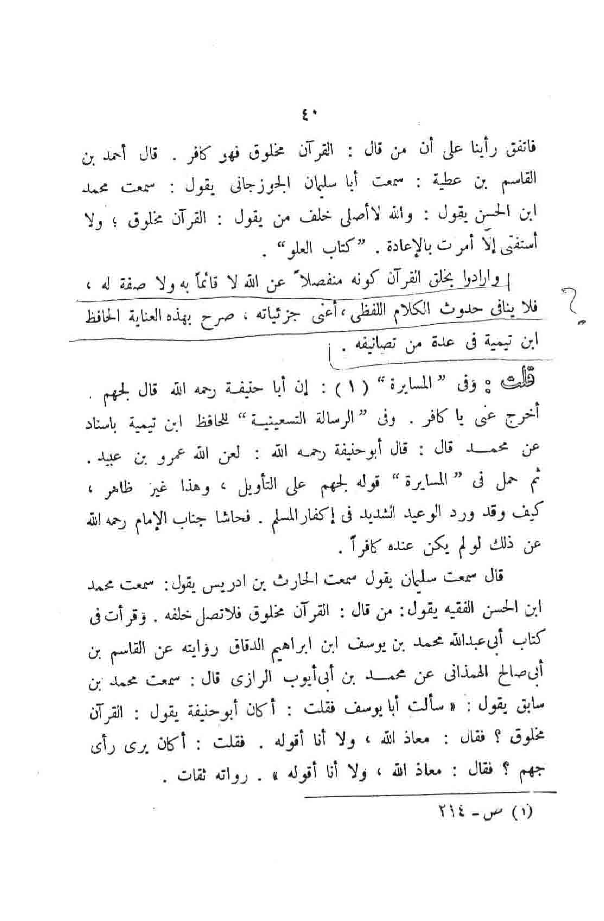 قلت: وفي "المسايرة": إن أبا حنيفة رحمه الله قال لجهم. أخرج عني يا كافر. وفي "الرسالة التسعينية" للحافظ ابن تيمية باسناد عن محمد قال: قال أبو حنيفة رحمه الله: لعن الله عمرو بن عبيد. ثم حمل في "المسايرة" قوله لجهم على التأويل، وهذا غير ظاهر، كيف وقد ورد الوعيد الشديد في إكفار المسلم. فحاشا جناب الإمام رحمه الله عن ذلك لو لم يكن عنده كافراً.