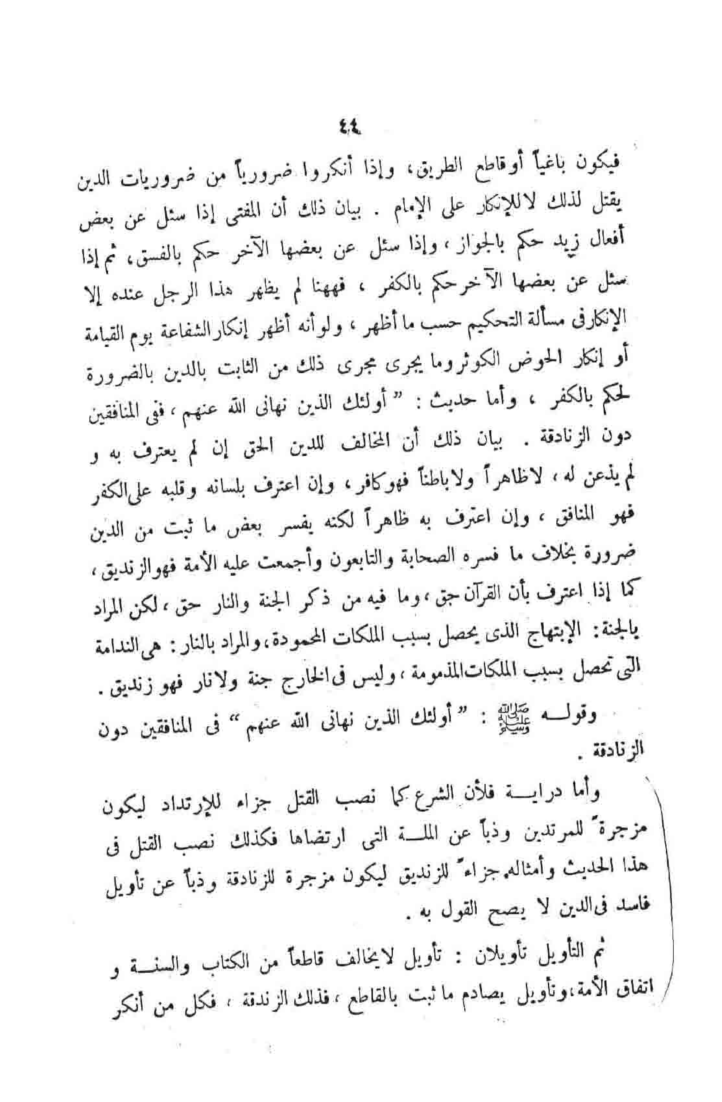 فيكون باغياً أو قاطع الطريق، وإذا أنكروا ضرورياً من ضروريات الدين يقتل لذلك لا للإنكار على الإمام. بيان ذلك أن المفتي إذا سئل عن بعض أفعال زبد حكم بالجواز، وإذا سئل عن بعضها الآخر حكم بالفسق، ثم إذا سئل عن بعضها الآخر حكم بالكفر، فههنا لم يظهر هذا الرجل عنده إلا الإنكار في مسألة التحكيم حسب ما أظهر، ولو أنه أظهر إنكار الشفاعة يوم القيامة أو إنكار الحوض الكوثر وما يجري مجرى ذلك من الثابت بالدين بالضرورة لحكم بالكفر، وأما حديث: "أولئك الذين نهاني الله عنهم، ففي المنافقين دون الزنادقة. بيان ذلك أن المخالف للدين الحق إن لم يعترف به ولم يذعن له، لا ظاهراً ولا باطناً فهو كافر، وإن اعترف بلسانه وقلبه على الكفر فهو المنافق، وإن اعترف به ظاهراً لكنه يفسر بعض ما ثبت من الدين ضرورة بخلاف ما فسره الصحابة والتابعون وأجمعت عليه الأمة فهو الزنديق، كما إذا اعترف بأن القرآن حق، وما فيه من ذكر الجنة والنار حق، لكن المراد بالجنة: الابتهاج الذي يحصل بسبب الملكات المحمودة، والمراد بالنار: هي الندامة التي تحصل بسبب الملكات المذمومة، وليس في الخارج جنة ولا نار فهو زنديق.