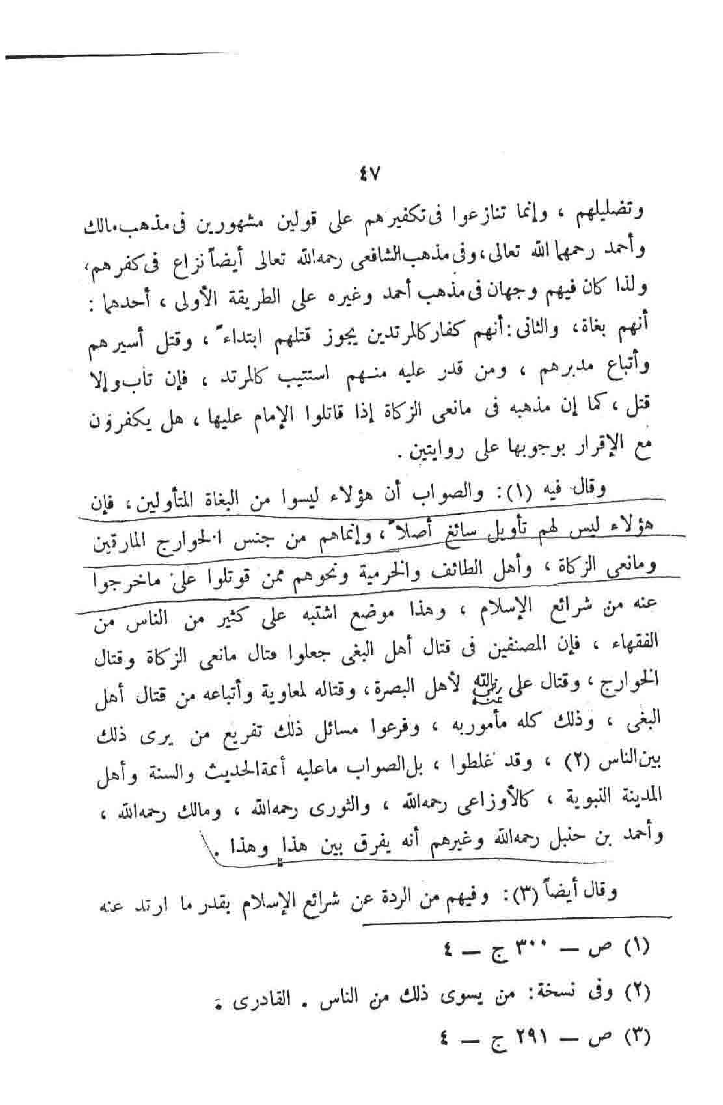 وقال فيه: والصواب أن هؤلاء ليسوا من البغاة المتأولين، فإن هؤلاء ليس لهم تأويل سائغ أصلاً، وإنما هم جنس الخوارج المارقين ومانعي الزكاة، وأهل الطائف والحرمية ونحوهم ممن قوتلوا على ما خرجوا عنه من شرائع الإسلام، وهذا موضع اشتبه على كثير من الناس من الفقهاء، فإن المصنفين في قتال أهل البغي جعلوا قتال مانعي الزكاة وقتال الخوارج، وقتال علي - رضي الله عنه - لأهل البصرة، وقتاله لمعاوية وأتباعه من قتال أهل البغي، وذلك كله مأمور به، وفرعوا مسائل ذلك تفريع من يرى ذلك بين الناس، وقد غلطوا، بل الصواب ما عليه أئمة الحديث والسنة وأهل المدينة النبوية، كالأوزاعي رحمه الله، والثوري رحمه الله، ومالك رحمه الله، وأحمد بن حنبل رحمه الله وغيرهم أنه يفرق بين هذا وهذا.