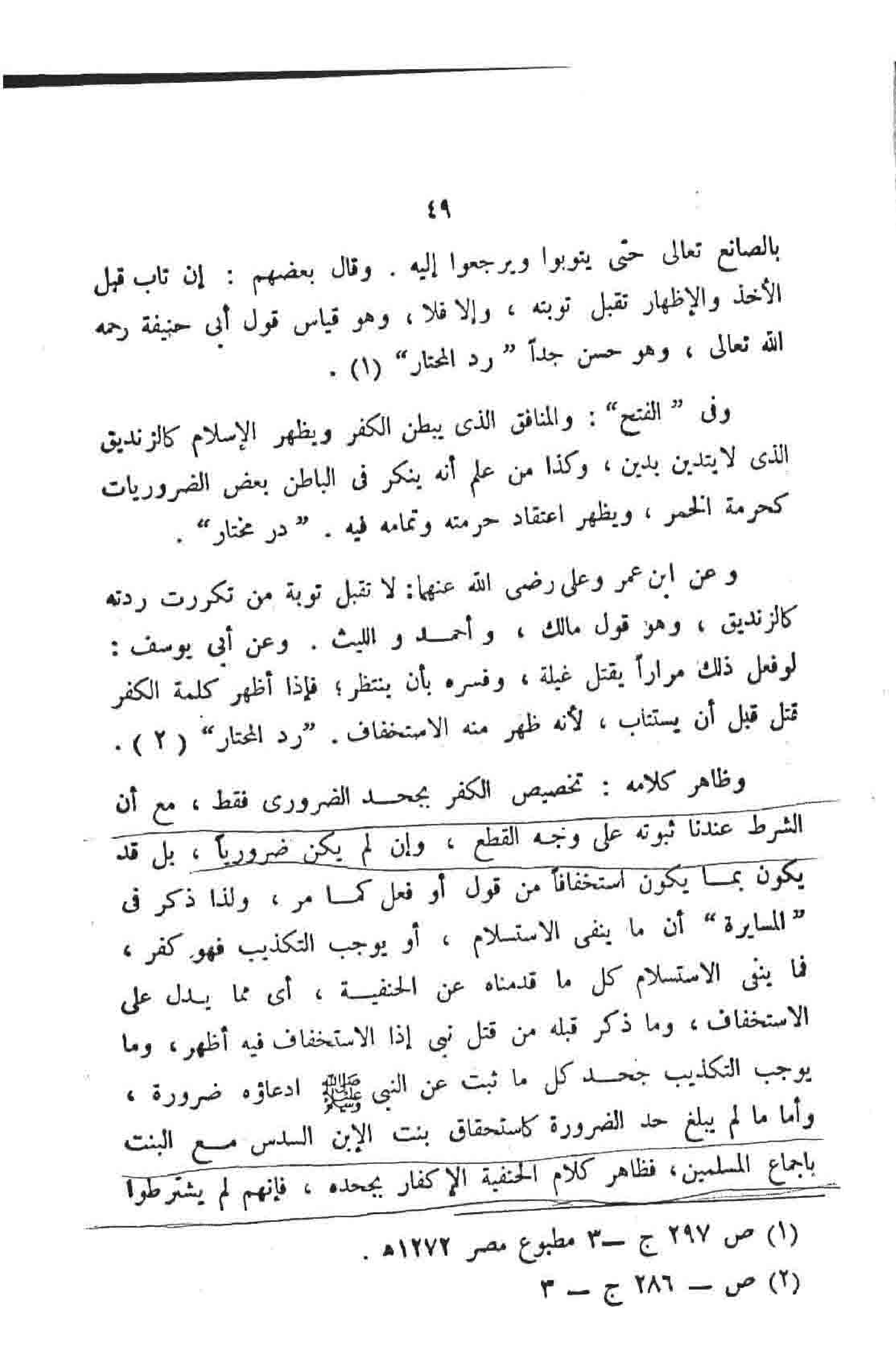 وفي "الفتح": والمنافق الذي يبطن الكفر ويظهر الإيمان كالزنديق الذي لا يتدين بدين، وكذا من علم أنه ينكر في الباطن بعض الضروريات كحرمة الخمر، ويظهر اعتقاد حرمته وتمامه فيه. "در مختار".