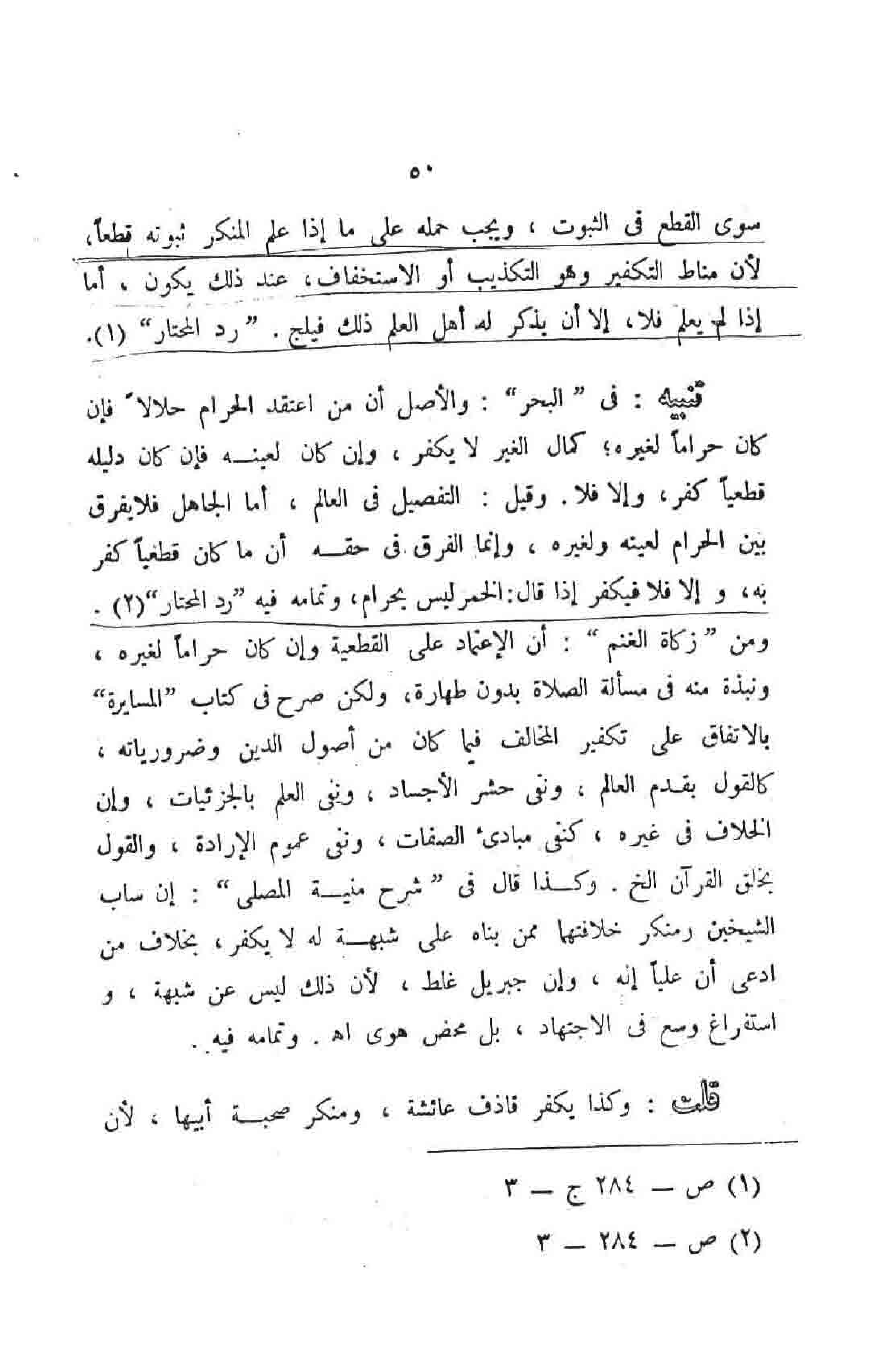 تنبيه: في "البحر" والأصل أن من اعتقد الحرام حلالاً فإن كان حراماً لغيره، كمال الغير لا يكفر، وإن كان لعينه فإن كان دليله قطعياً كفر، وإلا فلا. وقيل: التقصيل في العالم، أما الجاهل فلا يفرق بين الحرام لعينه ولغيره، وإنما الفرق في حقه أن ما كان قطعياً كفر به، وإلا فلا فيكفر إذا قال: الخمر ليس بحرام، وتمامه فيه "رد المحتار". ومن "زكاة الغنم": أن الإعتماد على القطعية وإن كان حراماً لغيره، ونبذة منه في مسألة الصلاة بجون طهارة، ولكن صرح في كتاب "المسايرة" بالاتفاق على تكفير المخالف فيما كان من أصول الدين وضرورياته، كالقول بقدم العالم، ونفي حشر الأجساد، ونفي العلم بالجزئيات، وإن الخلاف في غيره، كنفي كبادئ الصفات، ونفي عموم الإرادة، والقول بخلق القرآن إلخ. وكذا قال في "شرح منية المصلي": إن ساب الشيخين ومنكر خلافتهما ممن بناه على شبهة له لا يكفر، بخلاف من ادعى أن عليا إله، وإن جبريل غلط، لأن ذلك ليس عن شبهة، واستفراغ وسع في الاجتهاد، بل محض هوى اهـ. وتمامه فيه.