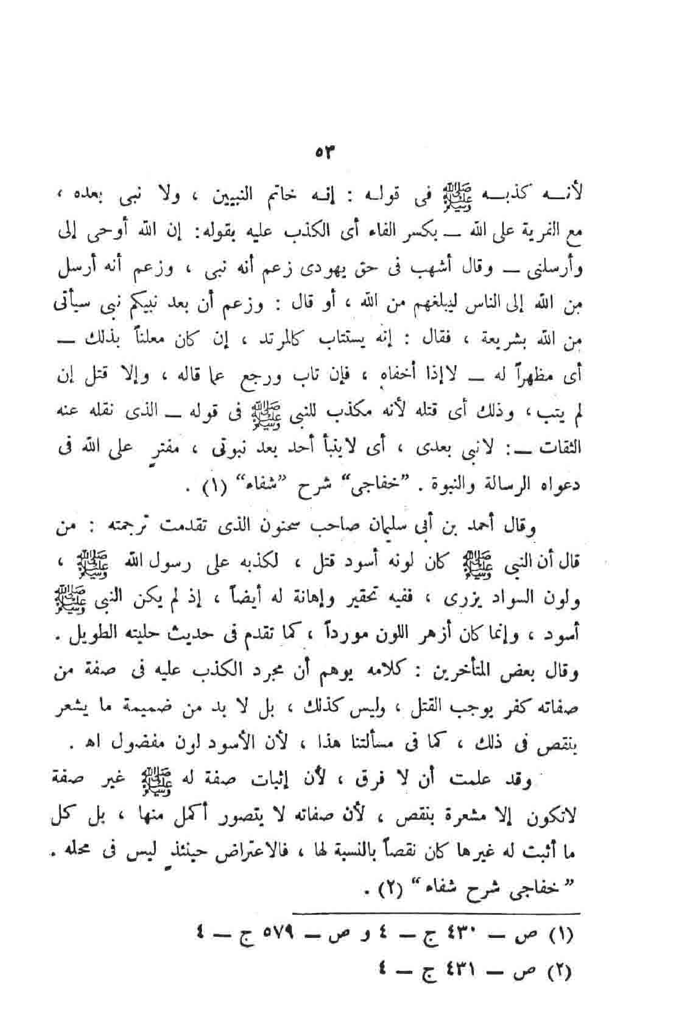 وقال أحمد بن أبس سليمان صاحب سحنون الذي تقدمت ترجمته: من قال أن النبي - صلى الله عليه وسلم - كان لونه أسود قتل، لكذبه على رسول الله - صلى الله عليه وسلم -، ولون السواد يزرى، ففيه تحقير وإهانة له أيضاً، إذ لم يكن النبي - صلى الله عليه وسلم - أسود، وإنما كان أزهر اللون مورداً، كما تقدم في حديث حليته الطويل. وقال بعض المتأخرين: كلامه يوهم أن مجرد الكذب عليه في صفة من صفاته كفر يوجب القتل، وليس كذلك، بل لابد من ضميمة ما يشعر بنقص في ذلك، كما في مسألتنا هذا، لأن الأسود لون مفضول اهـ.