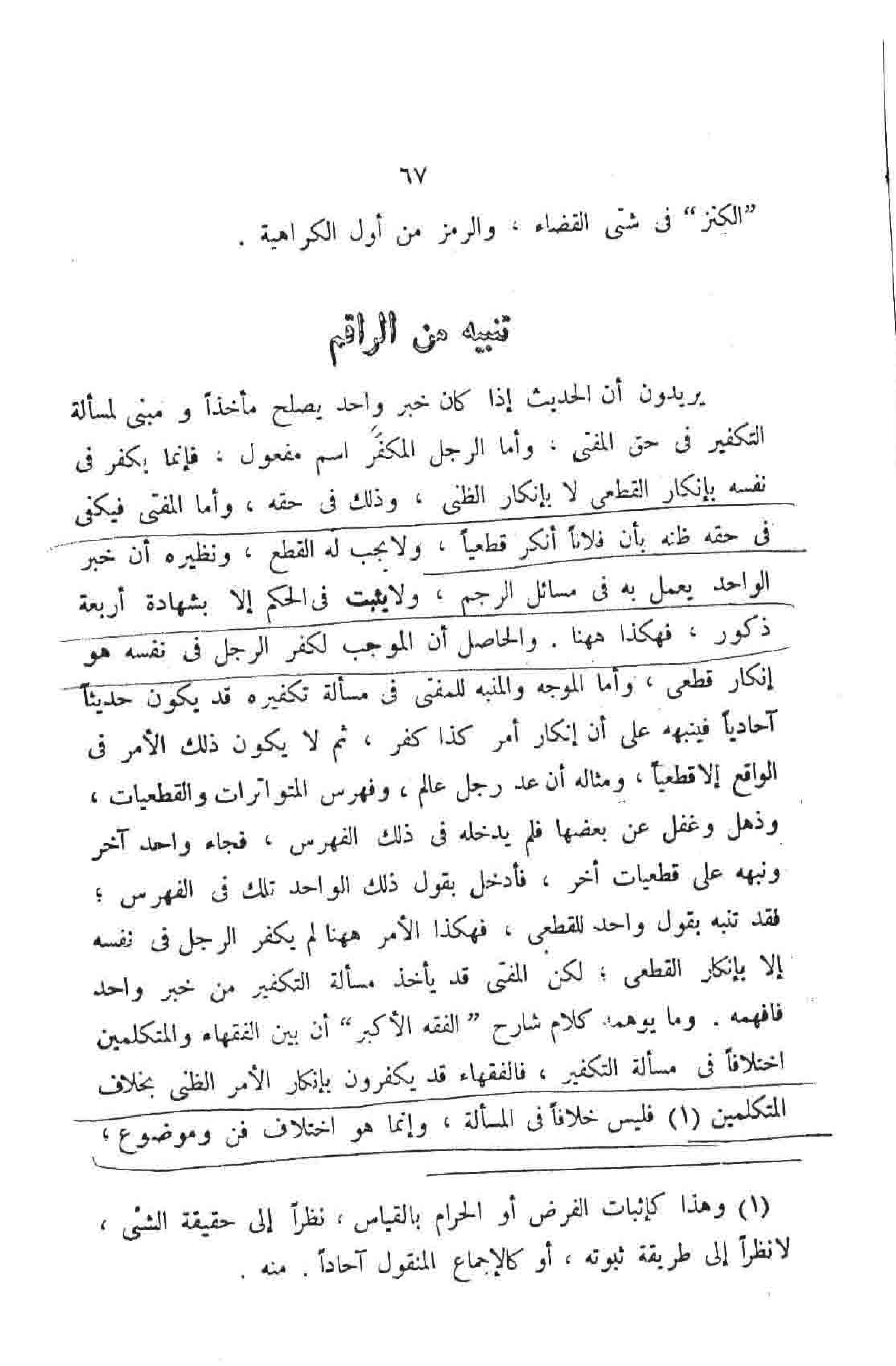 يريدون أن الحديث إذا كان خبر واحد يصلح مأخذاً ومبني لمسألة التكفير في حق المفتي، وأما الرجل المكفر اسم مفعول، فإنما يكفر في نفسه بإنكار القطعي لا بإنكار الظني، وذلك في حقه، وأما المفتي فيكفي في حقه ظنه بأن فلاناً أنكر قطعياً، ولا يجب له القطع، ونظيره أن خبر الواحد يعمل به في مسائل الرجم، ولا يثبت في الحكم إلا بشهادة أربعة ذكور، فهكذا ههنا، والحاصل أن الموجب لكفر الرجل في نفسه هو إنكار قطعي، وأما الموجه والمنبه للمفتي في مسألة تكفيره قد سكون حديثاً آحادياً فينبهه على أن إنكار أمر كذا كفر، ثم لا يكون ذلك الأمر في الواقع إلا قطعياً، ومثاله أن عد رجل عالم، وفهرس المتواترات والقطعيات، وذهل وغفل عن بعضها فلم يدخله في ذلك الفهرس، فجاء واحد آخر ونبهه على قطعيات أخر، فأدخل بقول ذلك الواحد تلك في الفرس؛ فقد تنبه بقول واحد للقطعي، فهكذا الأمر ههنا لم يكفر الرجل في نفسه إلا بإنكار القطعي، لكن المفتي قد يأخذ مسألة التكفير من خبر واحد فافهمه. وما يوهمه كلام شارح "الفقه الأكبر" أن بين الفقهاء والمتكلمين اختلافاً في مسألة التكفير، فالفقهاء قد يكفرون بإنكار الأمر الظني بخلاف المتكلمين فليس خلافاً في المسألة، وإنما هو اختلاف فن وموضوع،