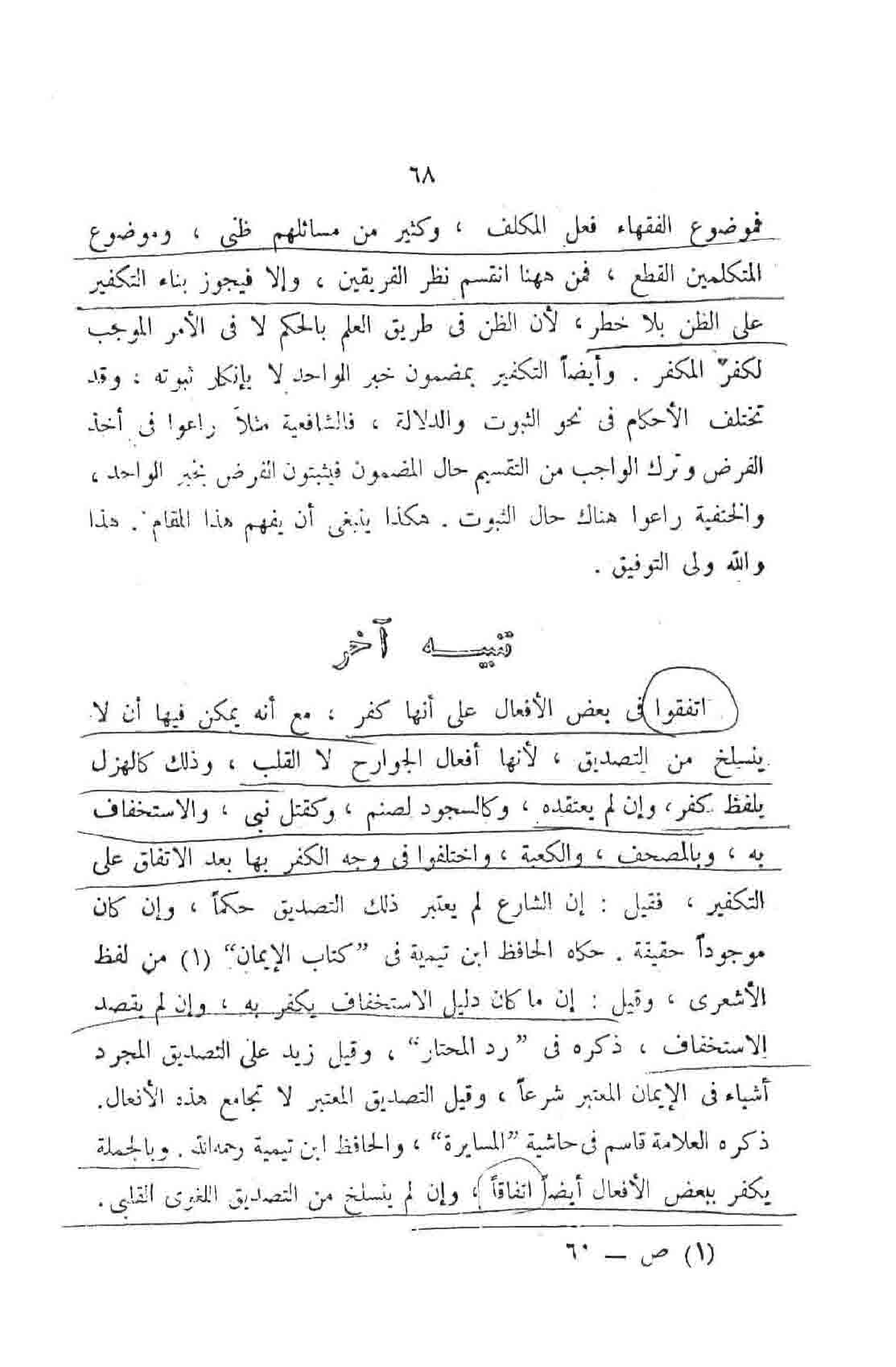 فموضوع الفقهاء فعل المكلف، وكثير من مسائلهم ظني، وموضوع المتكلمين القطع، فمن ههنا انقسم نظر الفريقين، وإلا فيجوز بناء التكفير على الظن بلا خطر، لأن الظن في طريق العلم بالحكم لا في الأمر الموجب لكفر المكفر. وأيضاً التكفير بمضمون خبر الواحد لا بإنكار ثبوته، وقد تختلف الأحكام في نحو الثبوت والدلالة، فالشافعية مثلاً راعوا في أخذ الفرض وترك الواجب من التقسيم حال المضمون فيثبتون الفرض بخبر الواحد، والحنفية راعوا هناك حال الثبوت. هكذا ينبغي أن يفهم هذا المقام. هذا والله ولي التوفيق.