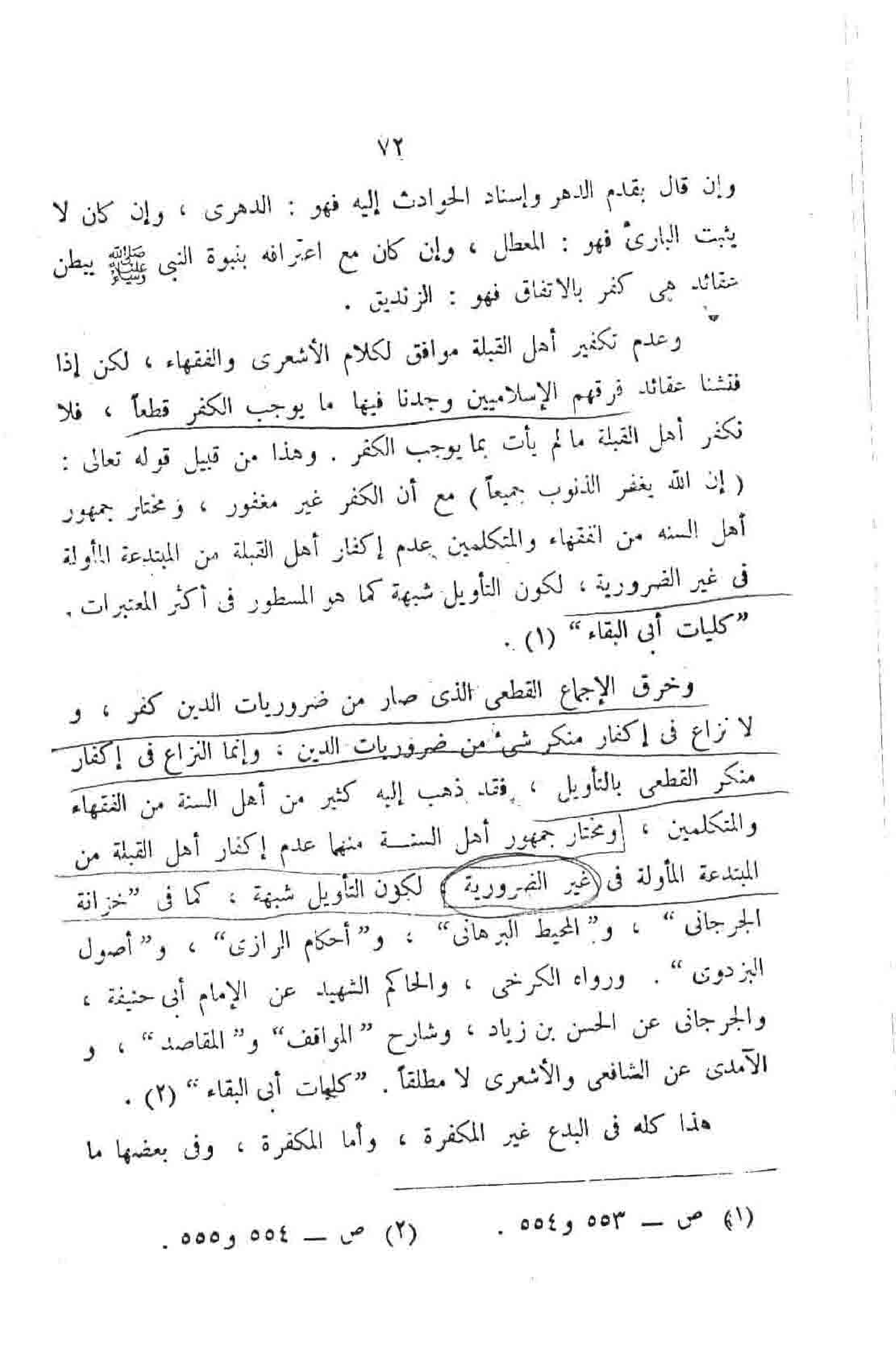 وعدم تكفير أهل القبلة موافق لكلام الأشعري والفقهاء، لكن إذا فتشنا عقائد فرقهم الإسلاميين وجدنا فيها ما يوجب الكفر قطعاً، فلا نكفر أهل القبلة ما لم يأت بما يوجب الكفر. وهذا من قيبل قوله تعالى: {إِنَّ اللَّهَ يَغْفِرُ الذُّنُوبَ جَمِيعًا} مع أن الكفر غير مغفور، ومختار جمهور أهل السنة من الفقهاء والمتكلمين عدم إكفار أهل القبلة من المبتدعة المأولة في غير الضرورية، لكون التأويل شبهة كما هو المسطور في أكثر المعتبرات. "كليات أبي البقاء".
