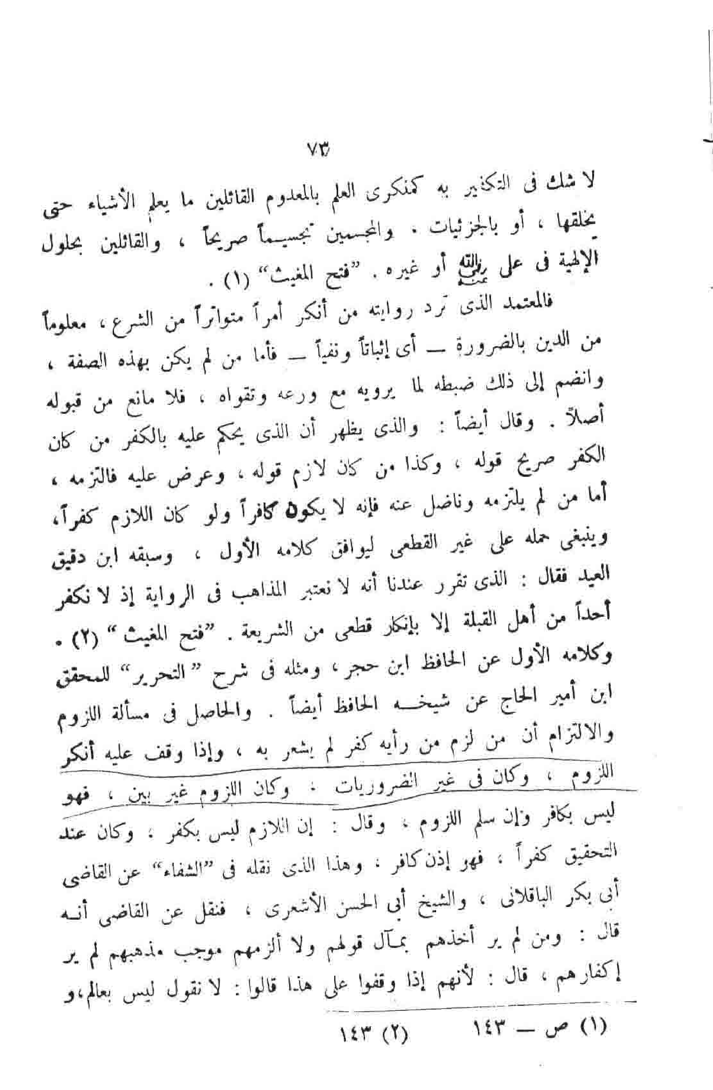 لا شك في التكفير به كمنكري العلم بالمعدوم القائلين ما يعلم الأشياء حتى يخلقها، أو بالجزئيات. والمجسمين تجسيماً صريحاً، والقائلين بحلول الإلهية في علي - رضي الله عنه - أو غيره. "فتح المغيث".