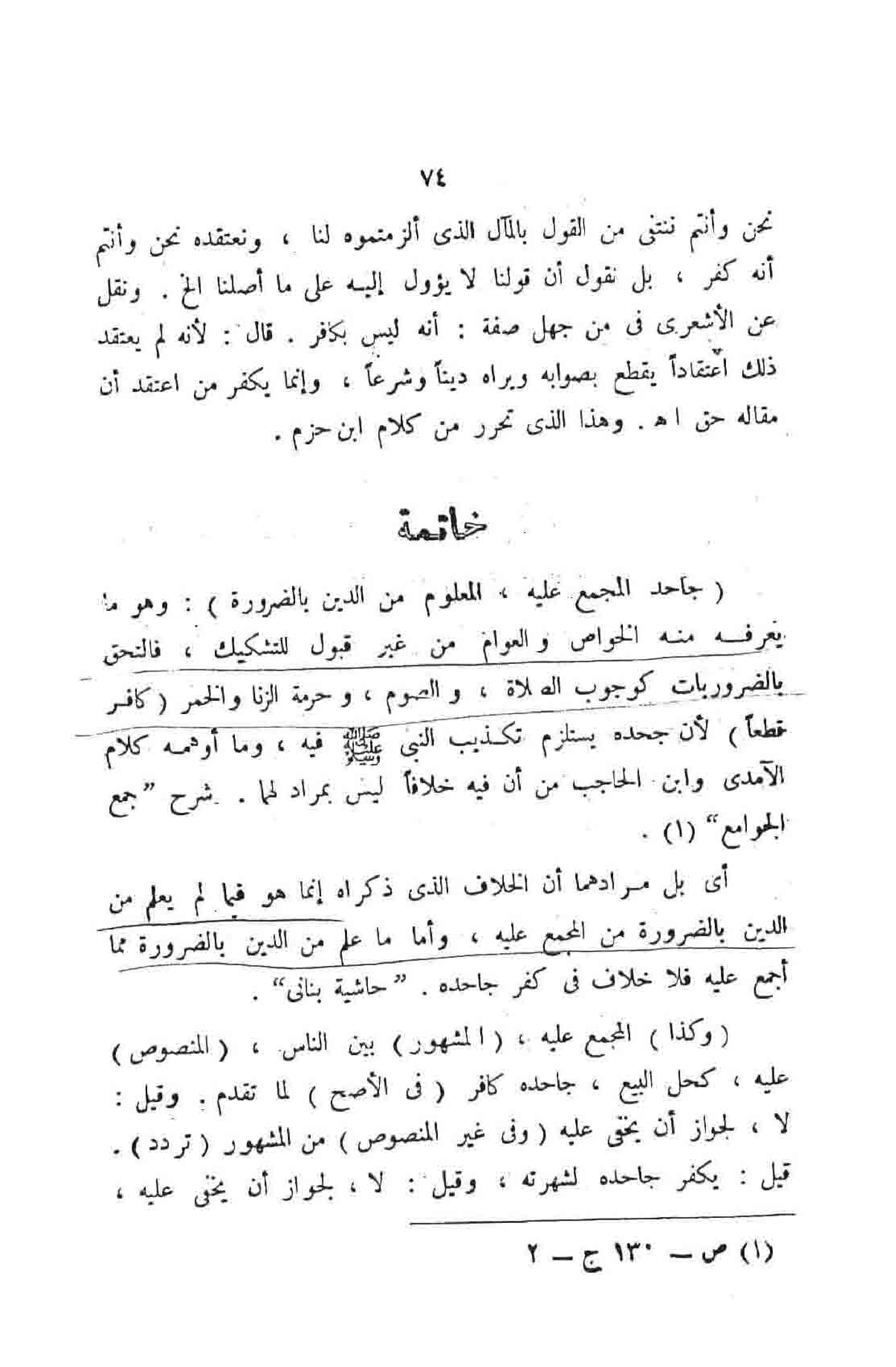 أي بل مرادهما أن الخلاف الذي ذكراه إنما هو فيما لم يعلم من الدين بالضرورة من المجمع عليه، وأما ما علم من الدين بالضرورة مما أجمع عليه فلا خلاف في كفر جاحده. "حاشية بناني".