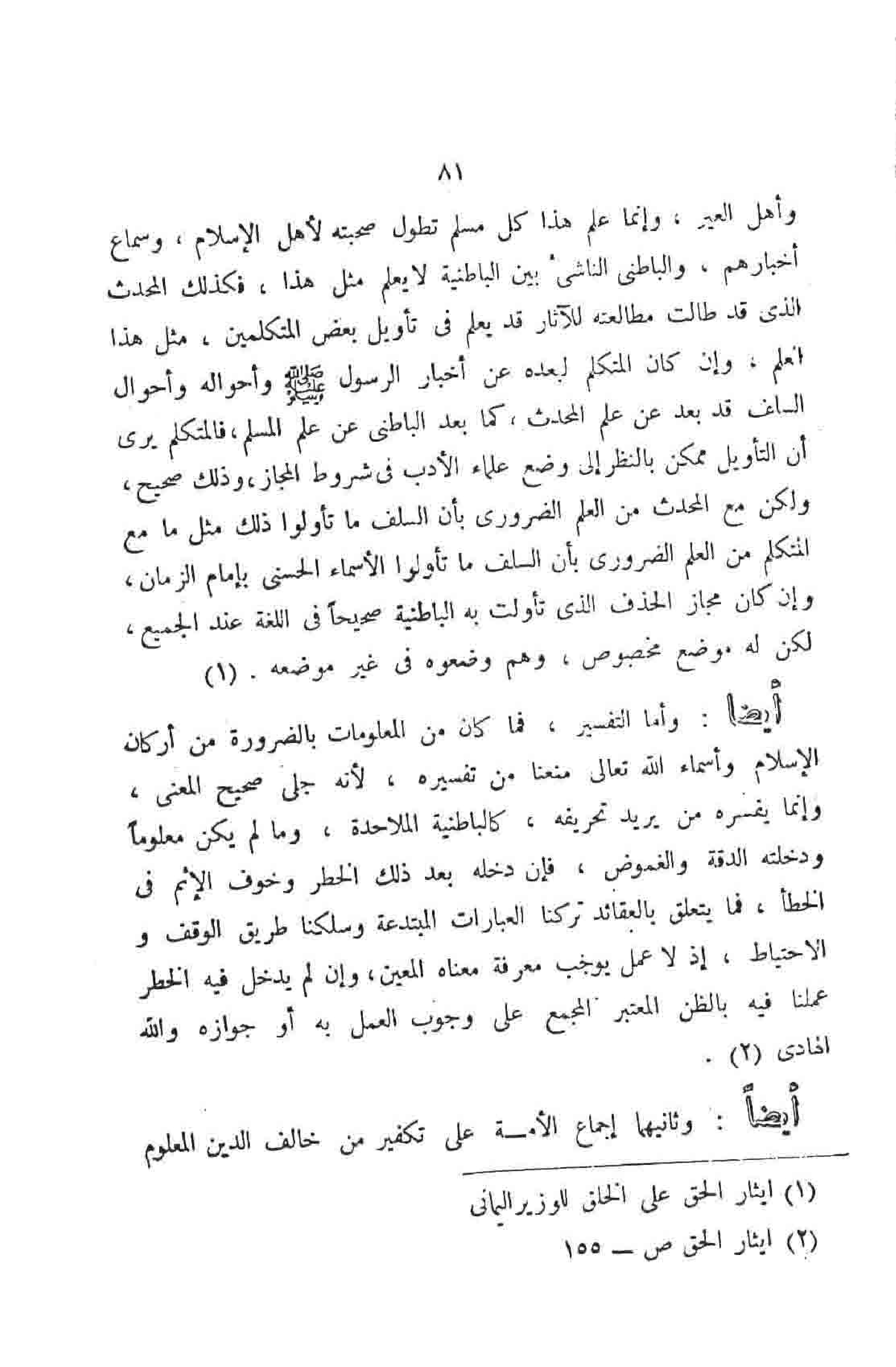 وأهل العير، وإنما علم هذا كل مسلم تطول صحبته لأهل الإسلام، وسماع أخبارهم، والباطني الناشئ بين الباطنية لا يعلم مثل هذا، فكذلك المحدث الذي قد طالت مطالعته للآثار قد يعلم في تأويل بعض المتكلمين، مثل هذا العلم، وإن كان المتكلم لبعده عن أخبار الرسول - صلى الله عليه وسلم - وأحواله وأحوال السلف قد بعد عن علم المحدث، كما بعد الباطني عن علم المسلم، فالمتكلم يرى أن التأويل ممكن بالنظر إلى وضع علماء الأدب في شروط المجاز، وذلك صحيح، ولكن مه المحدث من العلم الضروري بأن السلف ما تأولوا ذلك مثل ما مع المتكلم من العلم الضروري بأن السلف ما تأولوا الأسماء الحسنى بإمام الزمان، وإن كان مجاز الحذف الذي تأولت به الباطنية صحيحاً في اللغة عند الجميع، لكن له. وضع مخصوص، وهو وضعوه في غير موضعه.
