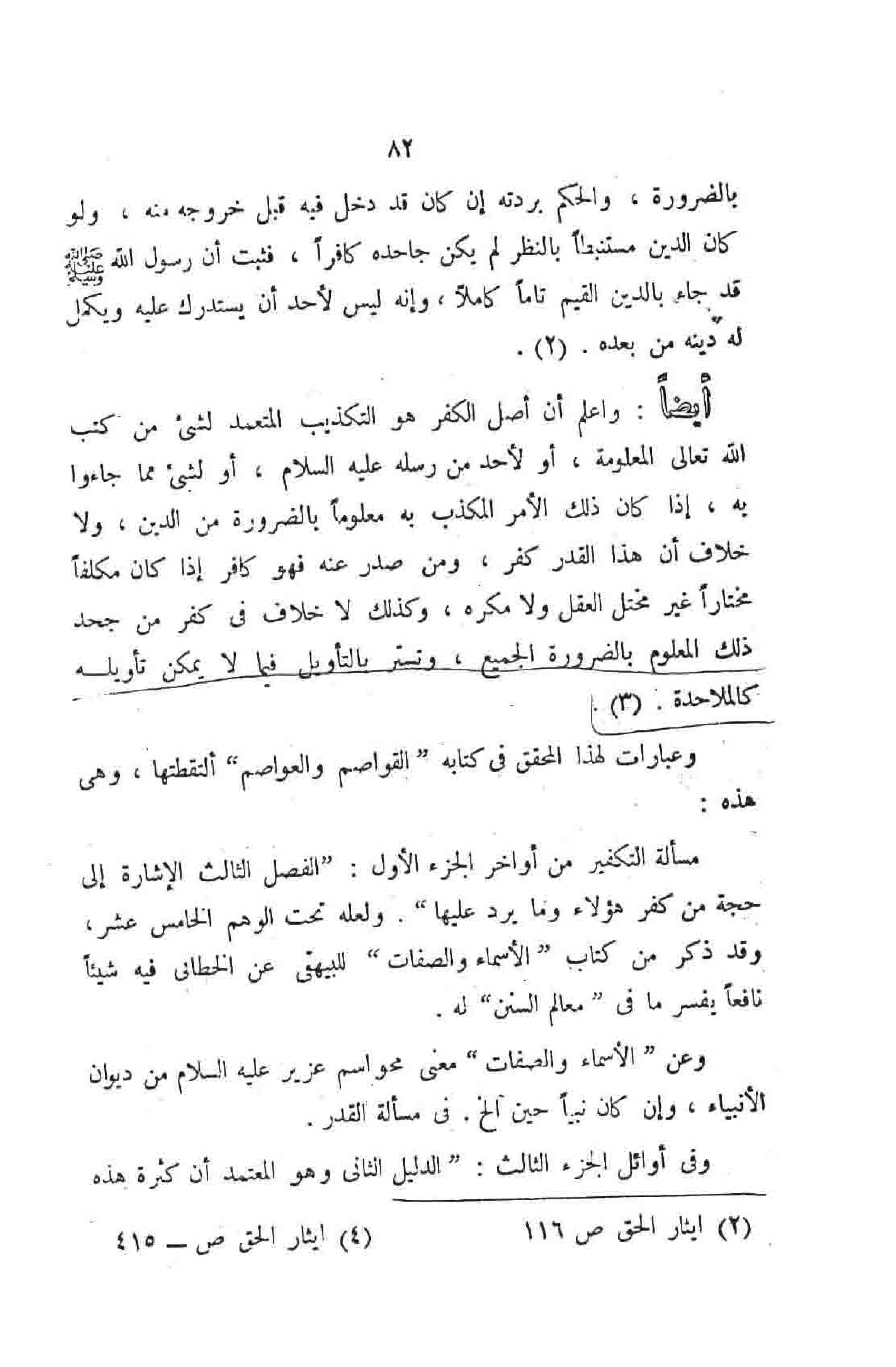 مسألة التكفير من أواخر الجزء الأول: "الفصل الثالث الإشارة إلى حجة من كفر هؤلاء وما يرد عليها". ولعله تحت الوهم الخامس عشر، وقد ذكر من كتاب "الأسماء والصفات" للبيهقي عن الخطابي فيه شيئاً نافعاً يفسر ما في "معالم السنن" له.