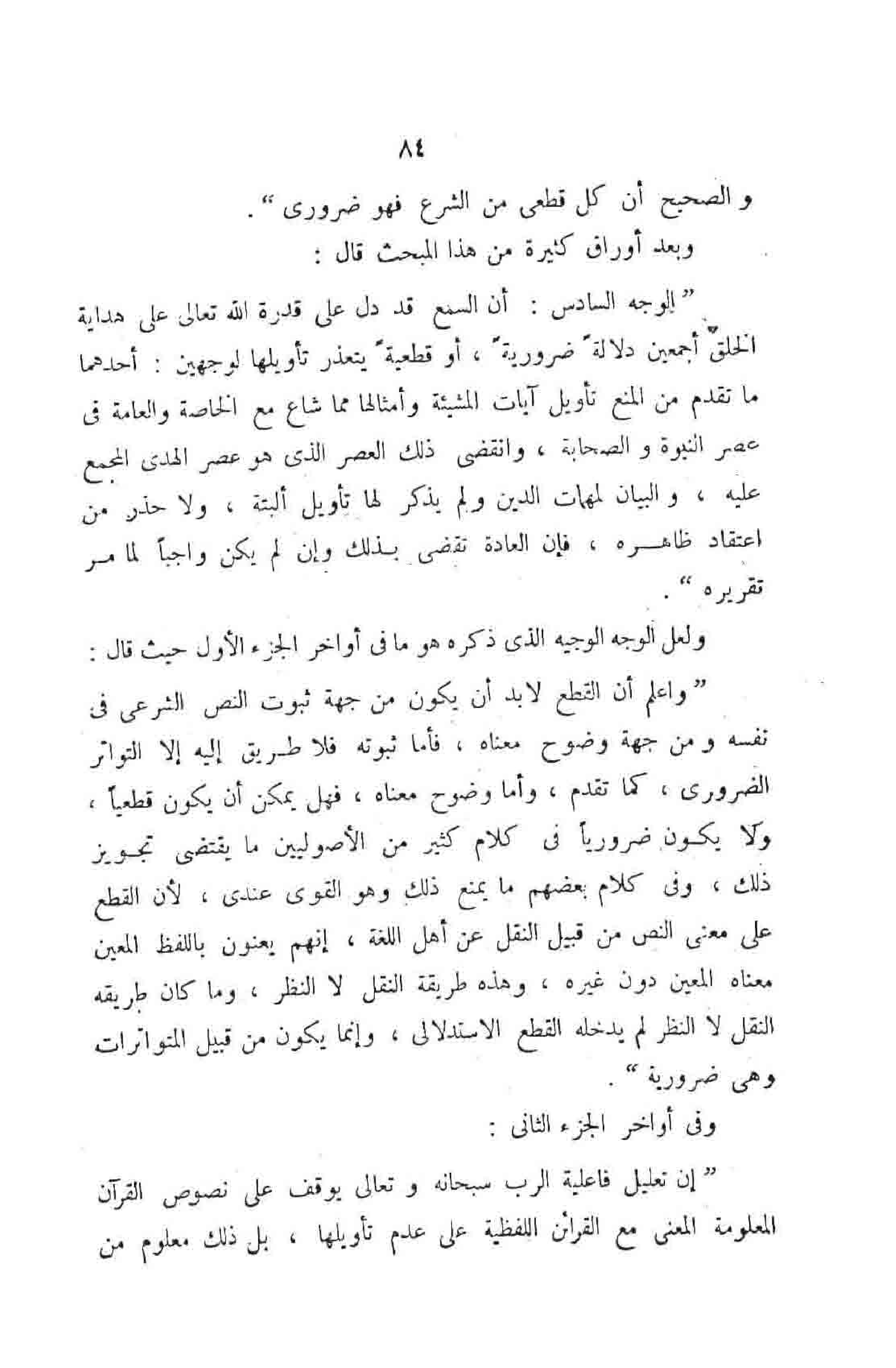 ولعل الوجه الوجيه الذي ذكره هو ما في أواخر الجزء الأول حيث قال: "وأعلم أن القطع لابد أن يكون من جهة ثبوت النص الشرعي في نفسه ومن جهة وضوح معناه، فأما ثبوته فلا طريق إليه إلا التواتر الضروري، كما تقدم، وأما وضوح معناه، فهل يمكن أن يكون قطعياً، ولا يكون ضرورياً في كلام كثير من الأصوليين ما يقتضي تجويز ذلك، وفي كلام بعضهم ما يمنع ذلك وهو القوى عندي، لأن القطع على معنى النص من قبيل النقل عن أهل اللغة، إنهم يعنون باللفظ المعين معناه المعين دون غيره، وهذه طريقة النقل لا النظر، وما كان طريقه النقل لا النظر لم يدخله القطع الاستدلالي، وإنما يكون من قبيل المتواترات وهي ضرورية".