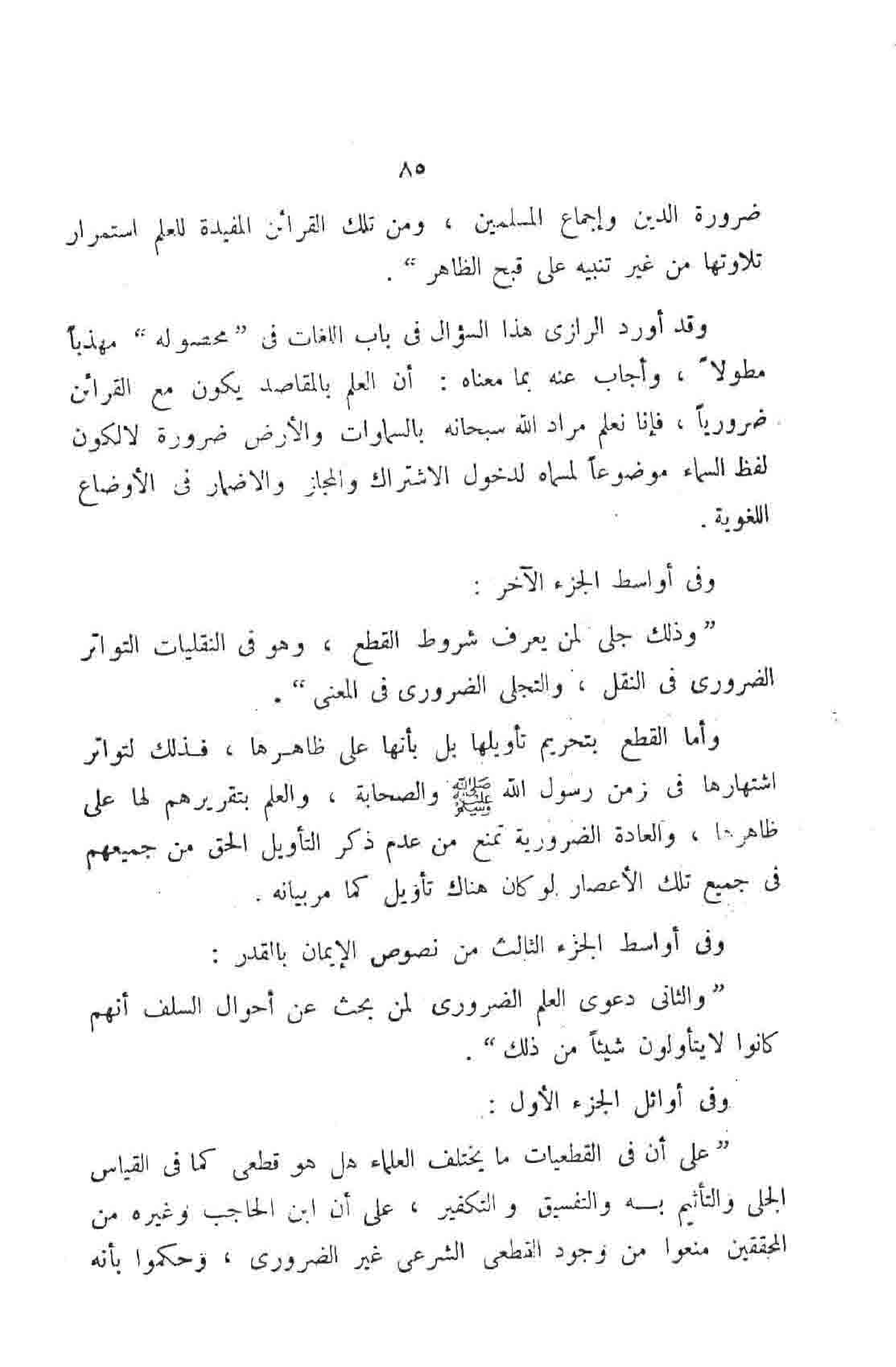 "وذلك جلى لمن يعرف شروط القطع، وهو في النقليات التواتر الضروري في النقل، والتجلي الضروري في المعنى".