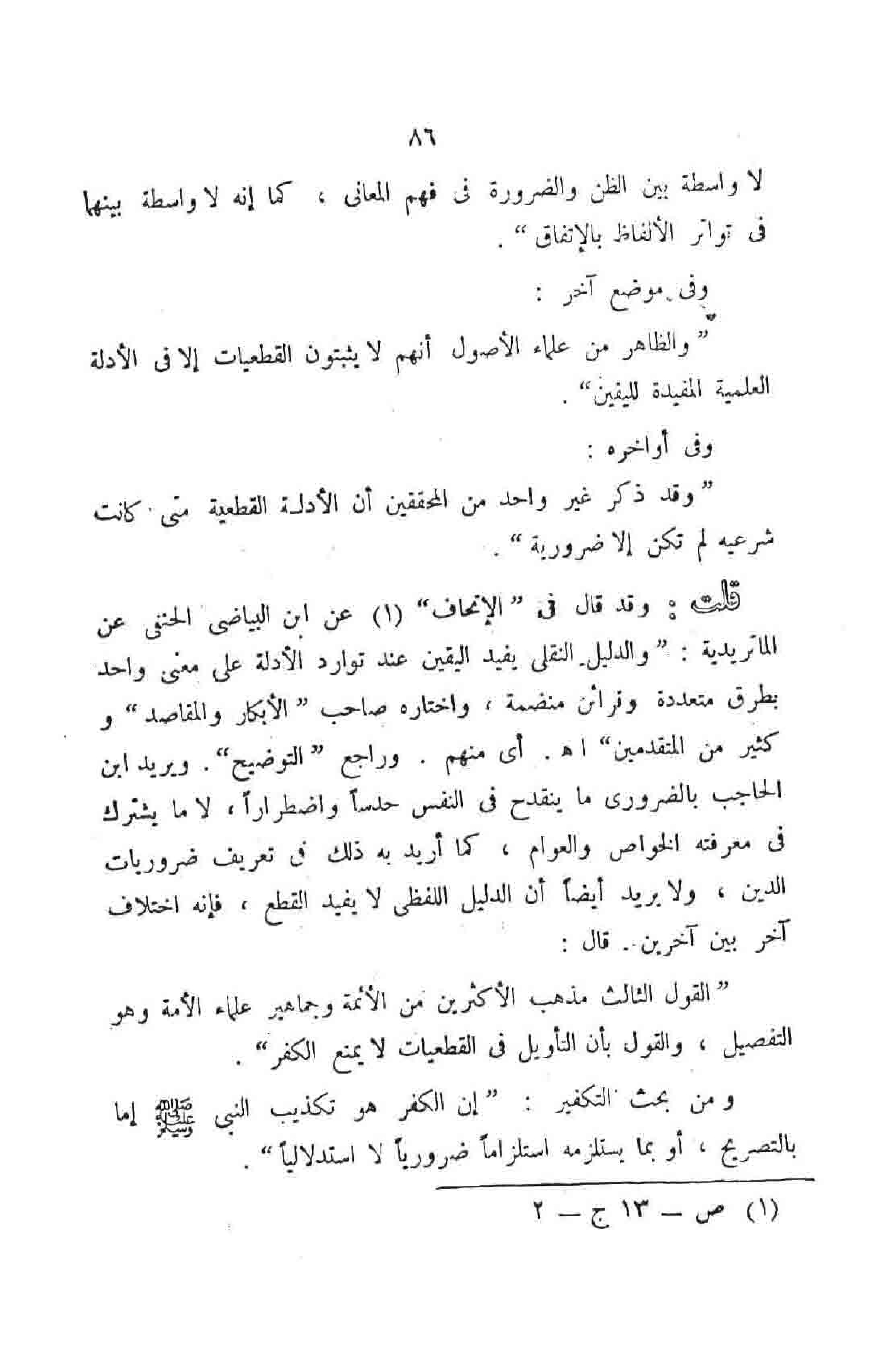 قلت: وقد قال في "الإتحاف" عن ابن البياضي الحنفي عن الماتريدية: "والدليل النقلي يفيد اليقين عند توارد الأدلة على معنى واحد بطرق متعددة وقرائن منضمة، واختاره صاحب "الأبكار والمقاصد" وكثير من المتقدمين" اهـ. أي منهم. وراجع "التوضيح". ويريد ابن الحاجب بالضروري ما ينقدح في النفس حدساً واضطراراً، لا ما يشترك في معرفته الخواص والعوام، كما أريد به ذلك في تعريف ضروريات الدين، ولا يريد أيضاً أن الدليل اللفظي لا يفيد القطعي، فإنه اختلاف آخر بين آخرين. قال: