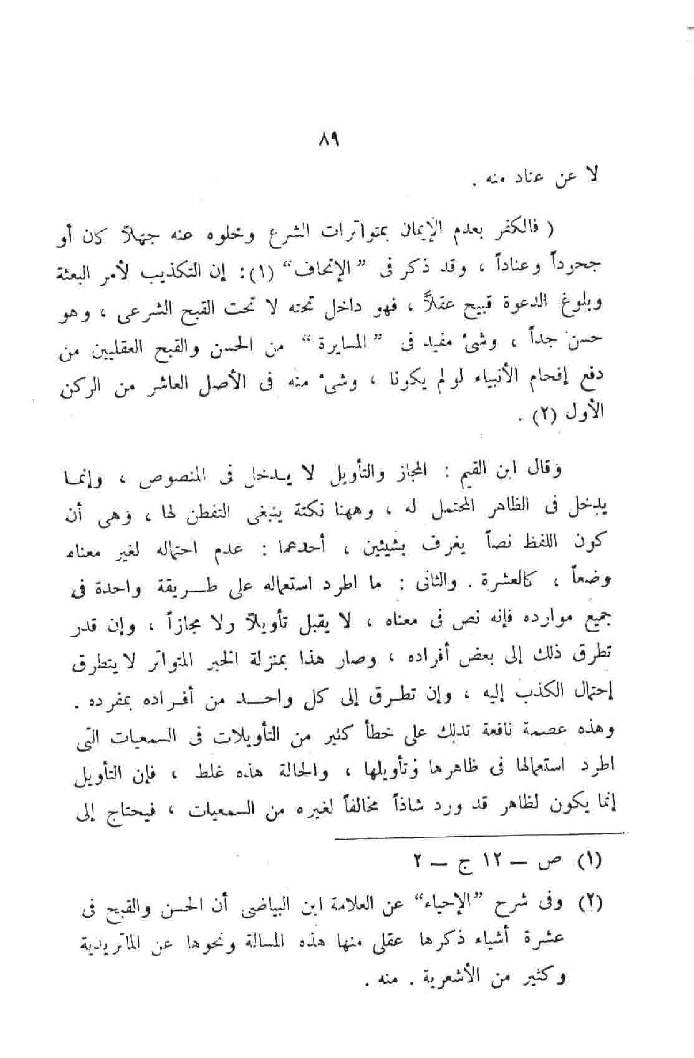 (فالكفر بعدم الإيمان بمتواترات الشرع وخلوه عنه جهلاً كان أو جحوداً وعناداً، وقد ذكر في "الإتحاف": إن التكذيب لأمر البعثة وبلوغ الدعوة قبيح عقلاً، فهو داخل تحته لا تحت القبح الشرعي، وهو حسن جداً، وشيء مفيد في "المسايرة" من الحسن والقبح العقليين من دفع إفحام الأنبياء لو لم يكونا، وشيء منه في الأصل العاشر من الركن الأول.
