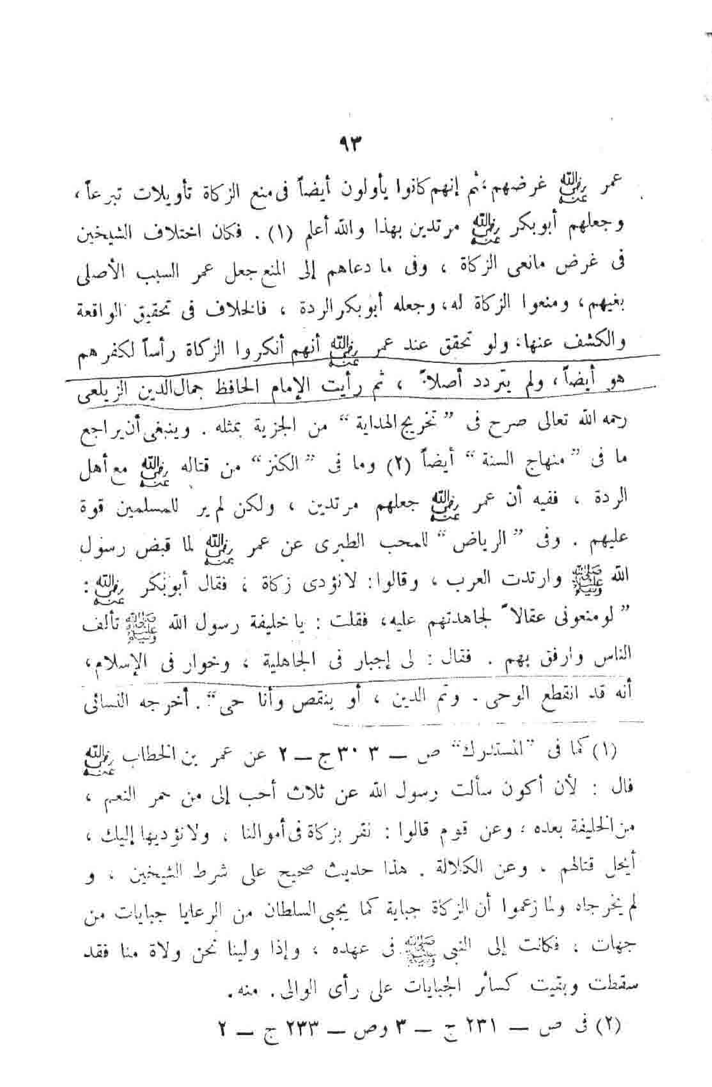 عمر - رضي الله عنه - غرضهم، ثم إنهم كانوا يأولون أيضاً في منع الزكاة تأويلات تبرعاً، وجعلهم أبو بكر - رضي الله عنه - مرتدين بهذا والله أعلم. فكان اختلاف الشيخين في غرض مانعي الزكاة، وفي ما دعاهم إلى المنع جعل عمر السبب الأصلي بغيهم، ومنعهم الزكاة له، وجعله أبو بكر الردة، فالخلاف في تحقيق الواقعة والكشف عنها، ولو تحقق عند عمر - رضي الله عنه - أنهم أنكروا الزكاة رأساً لكفرهم هو أيضاً، ولم يتردد أصلاً، ثم رأيت الإمام الحافظ جمال الدين الزيلعي رحمه الله تعالى صرح في "تخريج الهداية" من الجزية بمثله. وينبغي أن يراجع ما في "منهاج السنة" أيضاً وما في "الكنز" من قتاله - رضي الله عنه - مع أهل الردة، ففيه أن عمر - رضي الله عنه - جعلهم مرتدين، ولكن لم ير للمسلين قوة عليهم. وفي "الرياض" للمحب الطبري عن عمر - رضي الله عنه - لما قبض رسول الله - صلى الله عليه وسلم - وارتدت العرب، وقالوا: لا نؤدي زكاة، فقال أبو بكر - رضي الله عنه -: "لو منعوني عقالاً لجاهدتهمك عليه، فقلت: يا خليفة رسول الله - صلى الله عليه وسلم - تألف الناس وارافق بهم. فقال: لي إجبار في الجاهلية، وخوار في الإسلام، أنه قد انقطع الوحي، وتم الدين، أو ينقص وأنا حي". أخرجه النسائي.