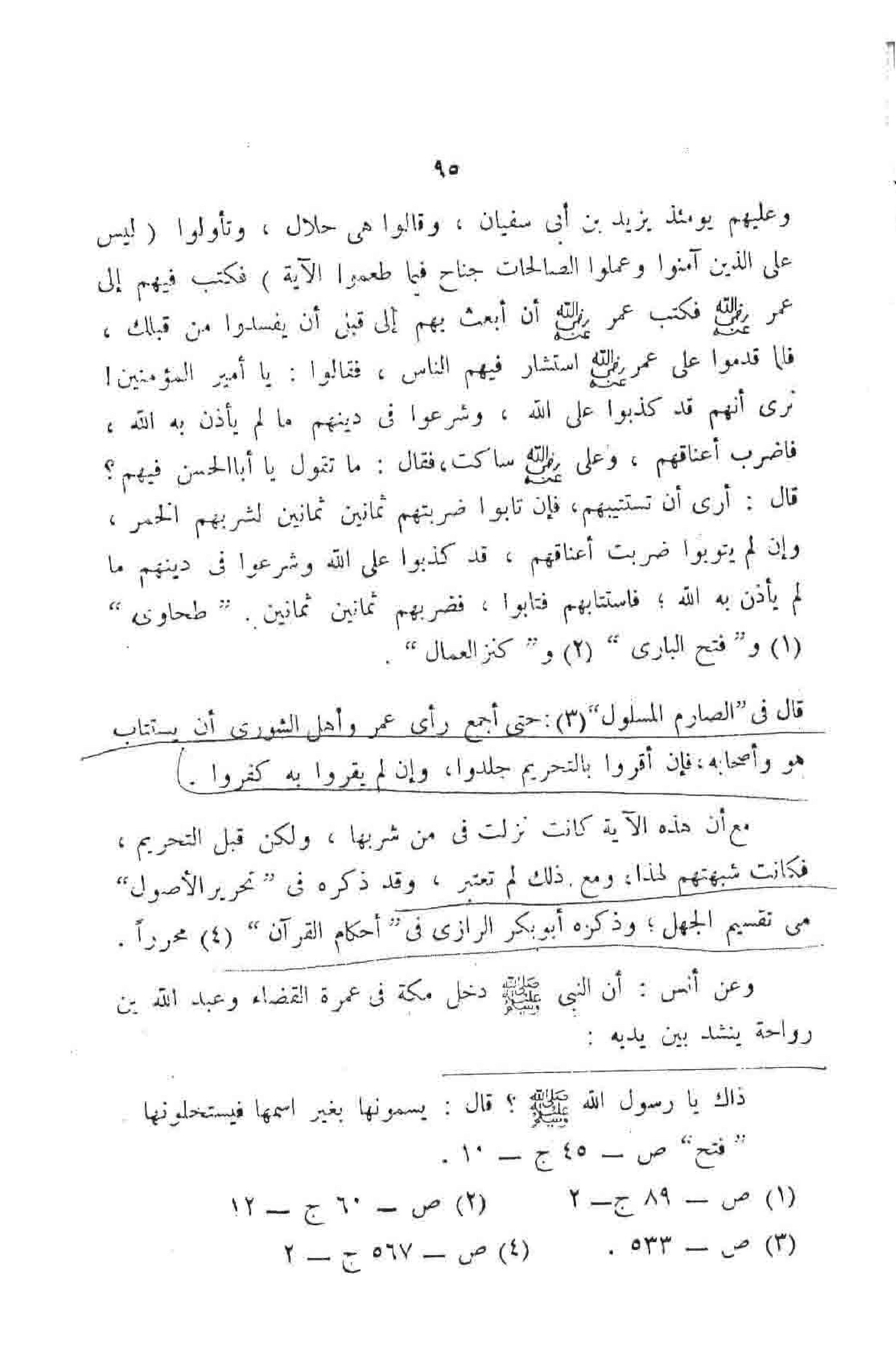 وعليهم يؤمئذ يزيد بن أبي سفيان، وقالوا هي حلال، وتأولوا {لَيْسَ عَلَى الَّذِينَ آمَنُوا وَعَمِلُوا الصَّالِحَاتِ جُنَاحٌ فِيمَا طَعِمُوا} الآية. فكتب فيهم إلى عمر - رضي الله عنه - فكتب عمر - رضي الله عنه - أن ألعث بهم إلى قبلي أن يفسدوا من قبلك، فلما قدموا على عمر - رضي الله عنه - استشار فيهم الناس، فقالوا: يا أمير المؤمنين! ترى أنهم قد كذبوا على الله، وشرعوا في دينهم ما لم يأذن به الله، فاضرب أعناقهم، وعلي - رضي الله عنه - ساكت، فقال: ما تقول يا أبا الحسن فيهم؟ قال: ارى أن تستتيبهم، فإن تابوا ضربتهم ثمانين ثمانين لشربهم الخمر، وإن لم يتوبوا ضربت أعناقهم، قد كذبوا على الله وشرعوا في دينهم ما لم يأذن به الله، فاستتابهم فتابوا، فضربهم ثمانين ثمانين، "طحاوي" و"فتح الباري" و"كنز العمال",