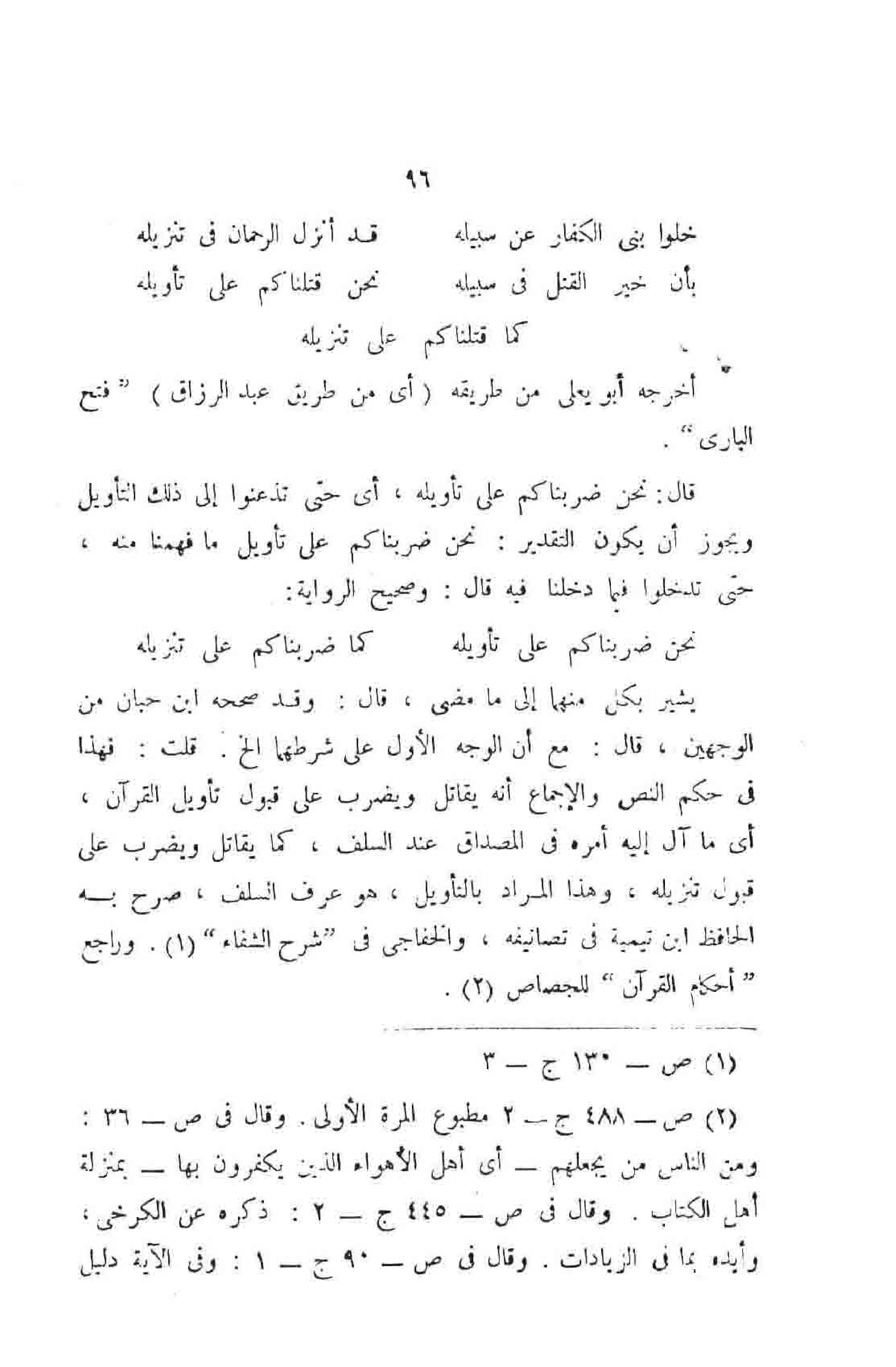 يشير بكل منهما إلى ما مضى، قال: وقد صححه ابن حبان من الوجهين، قال: مع أن الوجه الأول على شرطهما إلخ. قبلت: فهذا في حكم النص والإجماع أنه يقاتل ويضرب على قبول تأويل القرآن، أي ما آل إليه أمره في المصداق عند السلف، كما يقاتل ويضرب على قبول تنزيله، وهذا المراد بالتأويل، هو عرف السلف، صرح به الحافظ ابن تيمية في تصانيفه، والخفاجي في "شرح الشفاء". وراجع "أحكام القرآن" للحصاص.