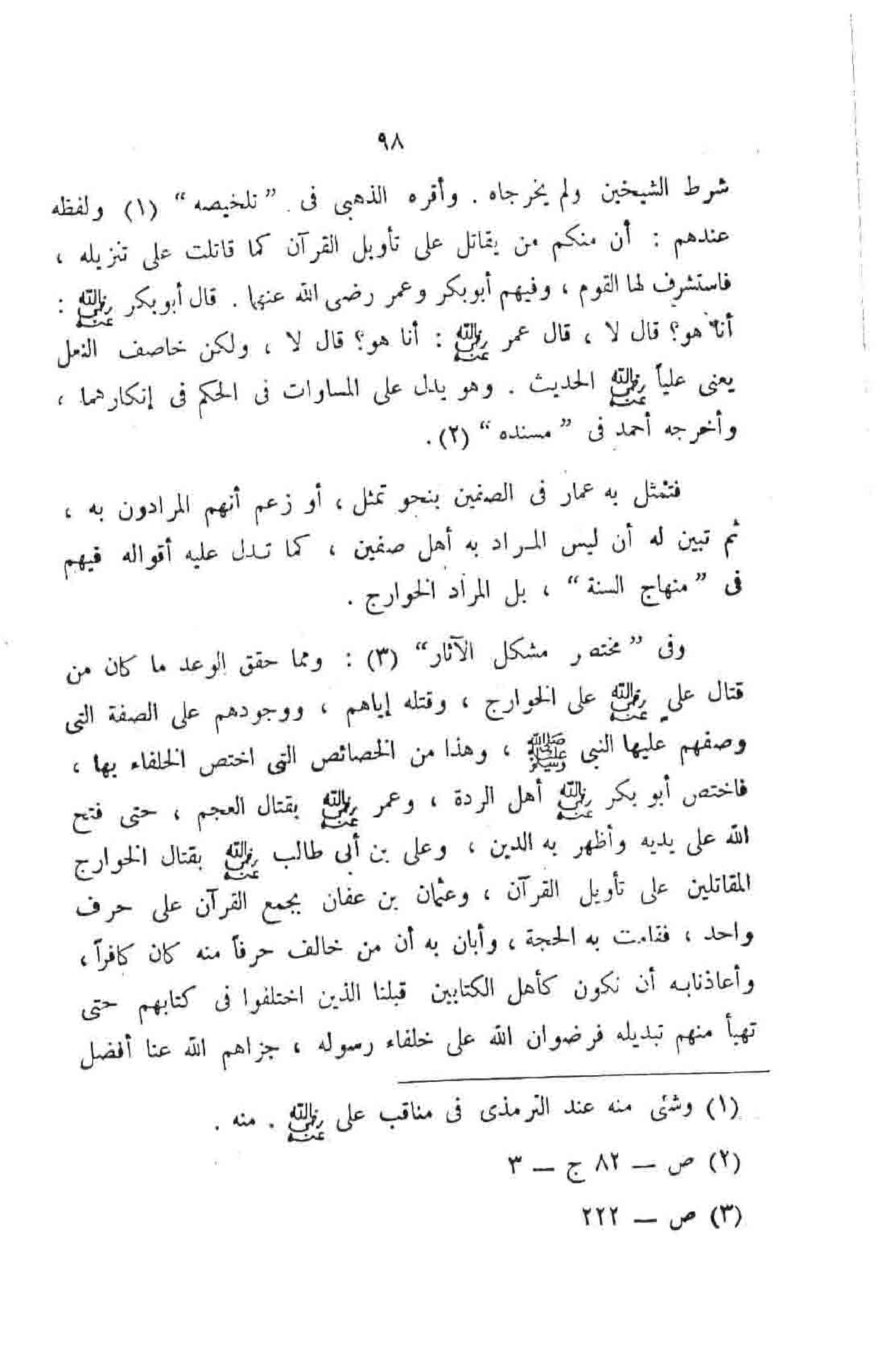 وفي "مختصر مشكل الآثار": ومما حقق الوعد ما كان من قتال علي - رضي الله عنه - على الخوارج، وقتله إياهم، ووجودهم على الصفة التي وصفهم عليها النبي - صلى الله عليه وسلم -، وهذا من الخصائص التي اختص الخلفاء بها، فاختص أبو بكر - رضي الله عنه - أهل الردة، وعمر - رضي الله عنه - بقتال العجم، حتى فتح الله على يديه وأظهر به الدبن، وعلي بن أبي طالب - رضي الله عنه - بقتال الخوارج المقاتلين على تأويل القرآن، وعثمان بن عفان بجمع القرآن على حرف واحد، فقامت به الحجة، وأبان به أن من خالف حرفاً منه كان كافراً، وأعاذنا به أن نكون كأهل الكتابين قبلنا الذين اختلفوا في كتابهم حتى تهيأ منهم تبديله فرضوان الله على خلفاء رسوله، جزاهم الله عنا أفضل