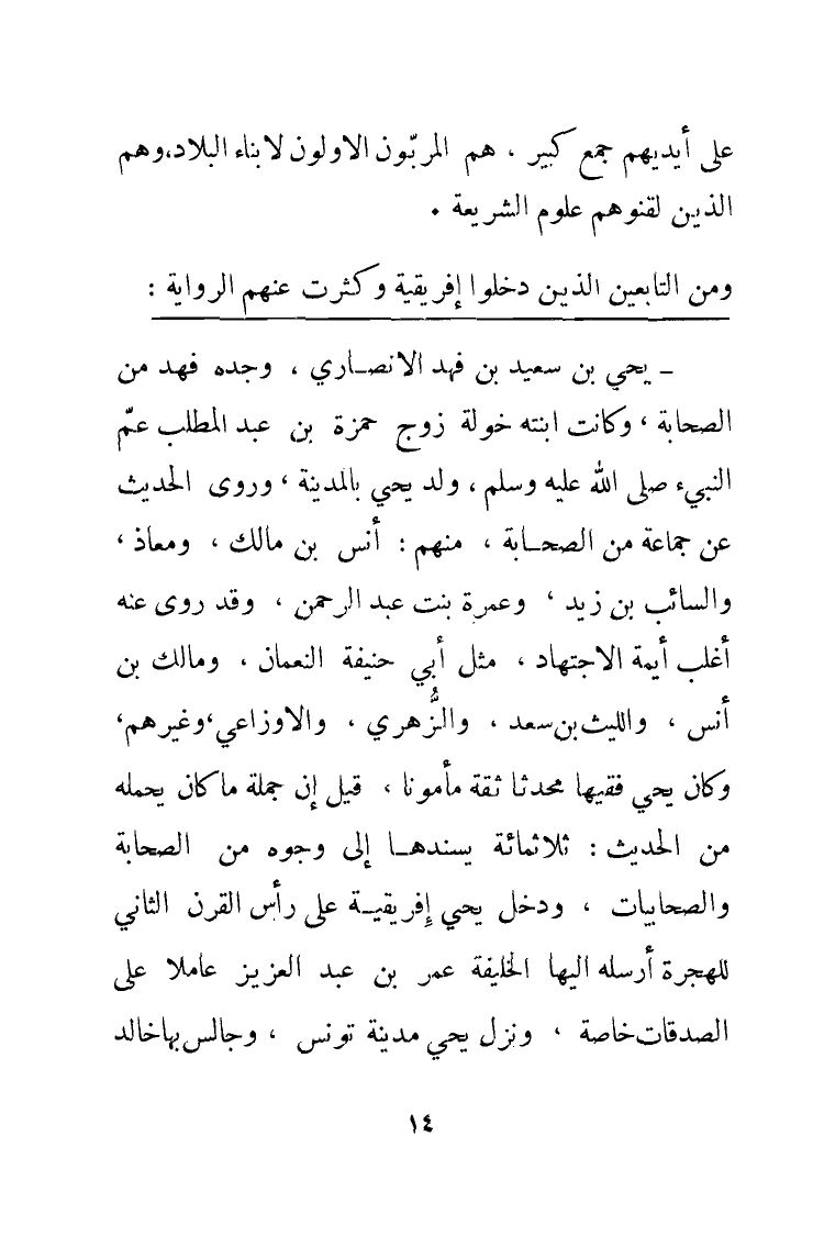 - يحي بن سعيد بن فهد الأنصاري، وجده فهد من الصحابة، وكانت ابنته خولة زوج حمزة بن عبد المطلب عم النبيء - صَلَّى اللهُ عَلَيْهِ وَسَلَّمَ -، ولد يحيى بالمدينة، وروى الحديث عن جماعة من الصحابة، منهم: أنس بن مالك، ومعاذ، والسائب بن زيد، وعمرة بنت عبد الرحمن، وقد روى عنه أغلب أيمة الاجتهاد، مثل أبي حنيفة النعمان، ومالك بن أنس، والليث بن سعد، والزهري، والاوزاعي، وغيرهم، وكان يحيى فقيهًا مُحَدِّثًا ثقة مأمونًا، قيل إن جملة ما كان يحمله من الحديث: ثلاثمائة يسندها إلى وجوه من الصحابة والصحابيات، ودخل يحيى إفريقية على رأس القرن الثاني للهجرة أرسله إليها الخليفة عمر بن عبد العزيز عاملاً على الصدقات خاصة، ونزل يحيى مدينة تونس، وجالس بها خالد