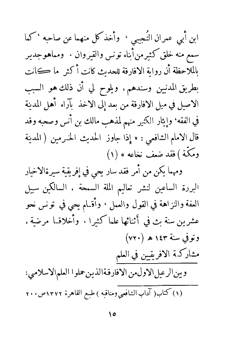 ابن أبي عمران التُّجِيبِي، وأخذ كل منهما عن صاحبه كما سمع منه خلق كثير من أبناء تونس والقيروان، ومما هو جدير بالملاحظة أن رواية الأفارقة للحديث كانت أكثر ما كانت بطريق المدنيين وسندهم، ويلوح لي أن ذلك هو السبب الأصيل في ميل الأفارقة من بعد إلى الأخذ بآراء أهل المدينة في الفقه، وإيثار الكثير منهم لمذهب مالك بن أنس وصحبه وقد قال الإمام الشافعي: «إذَا جَاوَزَ الحَديثُ الحَرَمَيْنِ (المَدِينَةِ وَمَكَّةَ) فَقَدْ ضَعُفَ نُخَاعُهُ» (¬1).