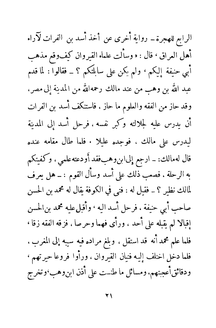 الرابع للهجرة - رواية أخرى عن أخذ أسد بن الفرات لآراء أهل العراق، قال: «وَسَأَلْتُ علماء القيروان كيف وقع مذهب أبي حنيفة إليكم، ولم يكن على سابلتكم؟ - فقالوا: لما قدم عبد الله بن وهب من عند مالك - رَحِمَهُ اللهُ - من المدينة إلى مصر، وقد حاز من الفقه والعلوم ما حاز، فاستنكف أسد بن الفرات أن يدرس عليه لجلالته وكبر نفسه، فرحل أسد إلى المدينة ليدرس على مالك، فوجده عليلاً، فلما طال مقامه عنده قال له مالك: " ارجع إلى ابن وهب فقد أودعته علمي، وكفيتكم به الرحلة، فصعب ذلك على أسد وسأل القوم: هل يعرف لمالك نظير؟ - فقيل له: فتى في الكوفة يقال له محمد بن الحسن صاحب أبي حنيفة، فرحل أسد إليه، وأقبل عليه محمد بن الحسن إقبالاً لم يقبله على أحد، ورأى فهمًا وحرصًا، فزقه الفقه زقًا فلما علم محمد أنه قد استقل، وبلغ مراده فيه سيبه إلى المغرب، فلما دخل اختلف إليه فتيان القيروان، ورأوا فروعًا حَيَّرَتْهُمْ وَدَقَائِقَ أَعْجَبَتْهُمْ، وَمَسَائِلَ مَا طَنَّتْ عَلَى أُذُنِ ابْنِ وَهْبٍ، وَتَخَرَّجَ