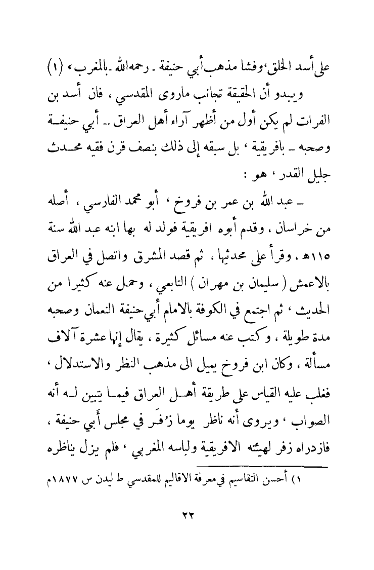 - عبد الله بن عمر بن فروخ، أبو محمد الفارسي، أصله من خراسان، وقدم أبوه إفريقية فولد له بها ابنه عبد الله سنة 115 هـ، وقرأ على محدثيها، ثم قصد الشرق واتصل في العراق بالأعمش (سليمان بن مهران) التابعي، وحمل عنه كثيرًا من الحديث، ثم اجتمع في الكوفة بالإمام أبي حنيفة النعمان وصحبه مدة طويلة، وكتب عنه مسائل كثيرة، يقال إنها عشرة آلاف مسألة، وكان ابن فروخ يميل إلى مذهب النظر والاستدلال، فغلب عليه القياس على طريقة أهل العراق فيما يتبين له أنه الصواب، ويروى أنه ناظر يومًا زُفَرَ في مجلس أبي حنيفة، فازدراه زُفَرُ لهيئته الإفريقية ولباسه المغربي، فلم يزل يناظره