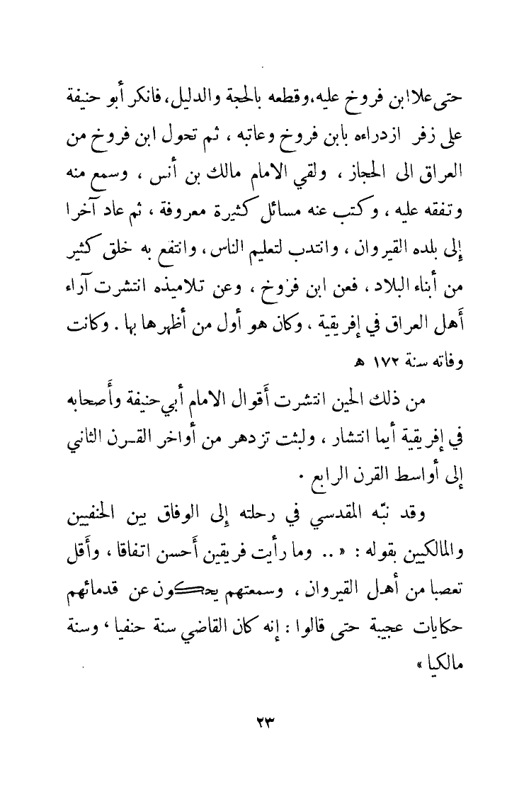 حتى علا ابن فروخ عليه، وقطعه بالحجة والدليل، فأنكر أبو حنيفة على زفر ازدارءه بابن فروخ وعاتبه، ثم تحول ابن فروخ من العراق إلى الحجاز، ولقي الإمام مالك بن أنس، وسمع منه وتفقه عليه، وكتب عنه مسائل كثيرة معروفة، ثم عاد آخرًا إلى بلده القيروان، وانتدب لتعليم الناس، وانتفع به خلق كثير من أبناء البلاد، فعن فروخ، وعن تلاميذه انتشرت آراء أهل العراق في إفريقية، وكان هو أول من أظهرها بها. وكانت وفاته سنة 172 هـ.
