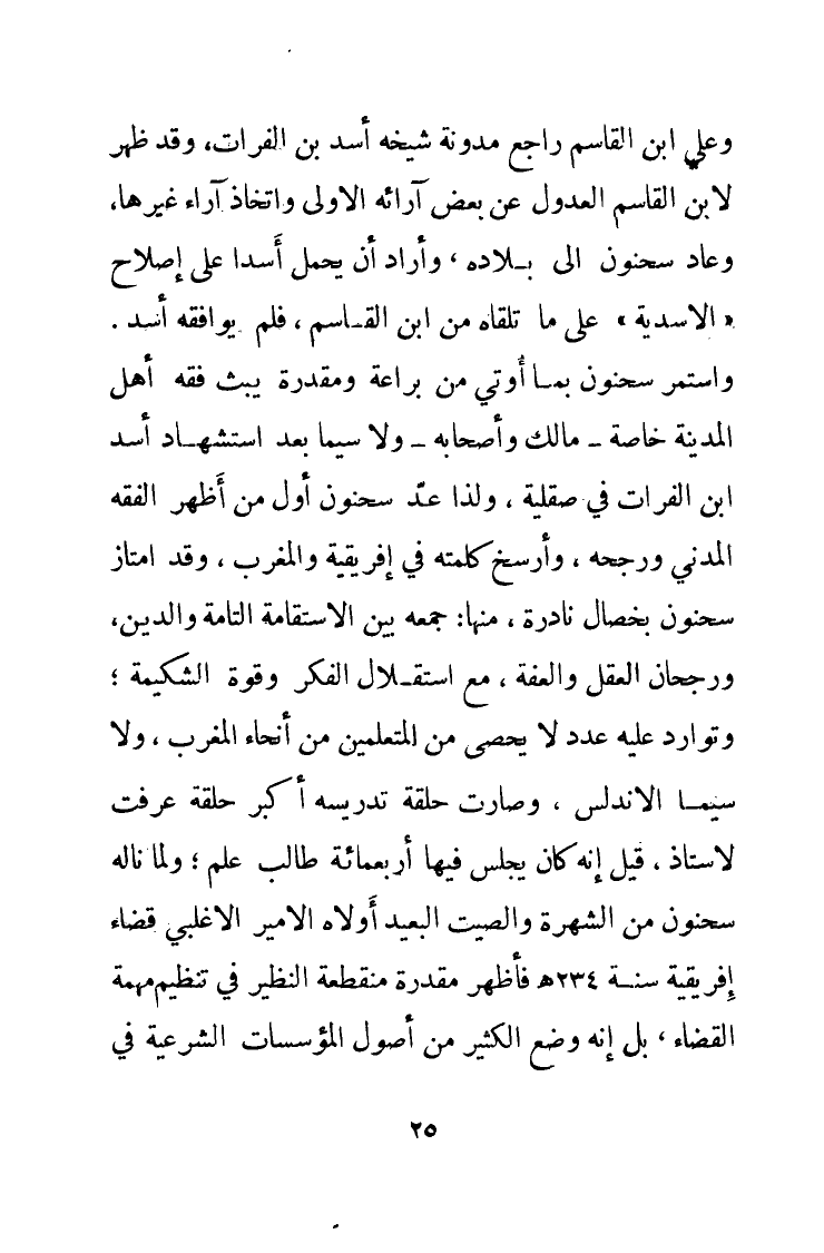 واستمر سحنون بما أوتي من براعة ومقدرة يبث فقه أهل المدينة خاصة - مالك وأصحابه - ولا سيما بعد استشهاد أسد بن الفرات في صقلية، وَلِذَا عُدَّ سحنون أول من أظهر الفقه المدني ورجحه، وأرسخ كلمته في إفريقية والمغرب، وقد امتاز سحنون بخصال نادرة، منها: جمعه بين الاستقامة التامة والدين، ورجحان العقل والعفة، مع استقلال الفكر وقوة الشكيمة؛ وتوارد عليه عدد لا يحصى من المتعلمين من أنحاء المغرب، ولا سيما الأندلس، وصارت حلقة تدريسه أكبر حلقة عرفت لأستاذ، قيل إنه كان يجلس فيها أربعمائة طالب علم؛ ولما ناله سحنون من الشهرة والصيت البعيد أولاه الأمير الأغلبي قضاء إفريقية سنة 234هـ فأظهر مقدرة منقطعة النظير في تنظيم مهمة القضاء، بل إنه وضع الكثير من أصول المؤسسات الشرعية في