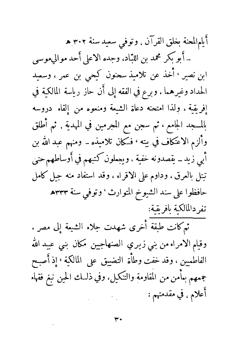 - أبوبكر محمد بن اللباد، وجده الأعلى أحد موالي موسى بن نصير، أخذ عن تلاميذ سحنون كيحيى بن عمر، وسعيد الحداد وغيرهما، وبرع في الفقه إلى أن حاز رياسة المالكية في إفريقية، ولذا امتحنه دعاة الشيعة ومنعوه من إلقاء دروسه بالمسجد الجامع، ثم سجن مع المجرمين في المهدية، ثم أطلق وألزم الاعتكاف في بيته، فكان تلاميذه - ومنهم عبد الله بن أبي زيد - يقصدونه خفية، ويجعلون كتبهم في أوساطهم حتى تبتل بالعرق، وداوم على الإقراء، وقد استفاد منه جيل كامل حافظوا على سند الشيوخ المتوارث، وتوفي سنة 333 هـ.
