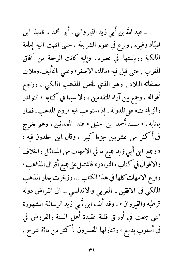 - عبد الله بن أبي زيد القيرواني، أبو محمد، تلميذ ابن اللباد وغيره، وبرع في علوم الشريعة، حتى انتهت إليه إمامة المالكية ورياستها في عصره، وإليه كانت الرحلة من آفاق المغرب، حتى قيل فيه «مالك الأصغر»، وعني بالتأليف، وملأت مصنفاته البلاد، وهو الذي لخص المذهب المالكي، وَرَجَّحَ أَقْوَالَهُ، وجمع بين آراء المتقدمين، ولا سيما في كتابه " النوادر والزيادات " على " المدونة "، إذ استوعب فيه فروع المذهب، فصار بمثابة، " مسند أحمد بن حنبل " عند المحدثين، وهو يخرج في أكثر من عشرين جُزْءًا كبيرًا (¬1)، وقال ابن خلدون فيه: «وَجَمَعَ ابْنُ أَبِي زَيْدٍ جَمِيعَ مَا فِي الأُمَّهَاتِ مِنَ المَسَائِلِ وَالخِلاَفِ وَالأَقْوَالِ فِي كِتَابِ " النَّوَادِرِ " فَاشْتَمَلَ عَلَى جَمِيعِ أَقْوَالِ المَذَاهِبِ، وَفَرْعِ الأَمَّهَاتِ كُلِّهَا فِي هَذَا الكِتَابِ ... وَزَخَرَتْ بِحَارُ المَذْهَبِ المَالِكِيِّ فِي الأُفُقَيْنِ - المَغْرِبِيِّ وَالأَنْدَلُسِيِّ - إِلَى انْقِرَاضِ دَوْلَةِ قُرْطُبَةَ وَالقَيْرَوَانِ» (¬2).