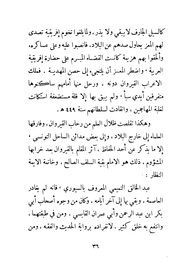 وهكذا تقلص ظلال العلم من رحاب القيروان، وفارقها العلماء إلى خارج البلاد، وإلى بعض مدائن الساحل التونسي، إلا ما يذكر عن أحد الحفاظ، آثر المقام بالقيروان بعد خرابها المشؤوم، ذلك هو الإمام بقية السلف الصالح، وخاتمة الأيمة النظار: