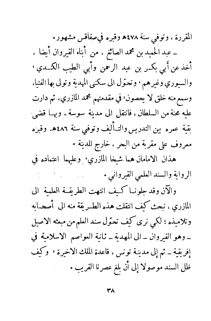 والآن وقد جلونا كيف انتهت الطريقة العلمية إلى المازري، نبحث كيف انتقلت هذه الطريقة منه إلى إصحابه وتلاميذه، لكي نرى كيف تحول سند العلم من مبحثه الأصيل - وهو القيروان - إلى المهدية - ثانية العواصم الإسلامية في إفريقية - ثم إلى مدينة تونس، قاعدة الملك الأخيرة، وكيف ظل السند موصولاً إلى أن بلغ عصرنا القريب.