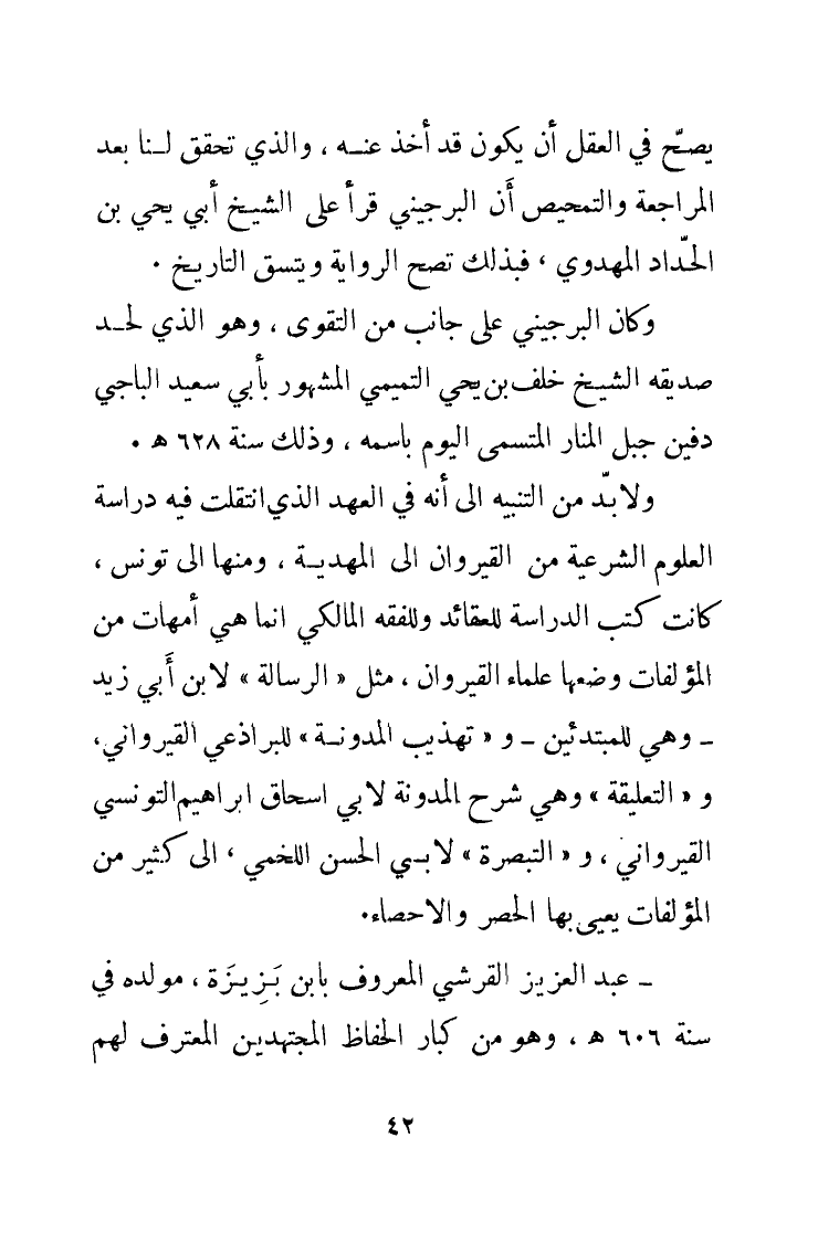 يصح في العقل أن يكون قد أخذ عنه، والذي تحقق لنا بعد المراجعة والتمحيص أن البرجيني قرأ على الشيخ أبي يحيى بن الحداد المهدوي، فبذلك تصح الرواية ويتسق التاريخ.