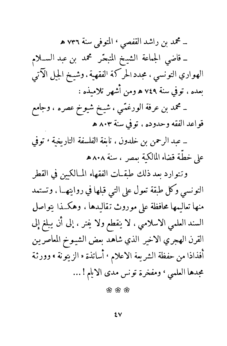 وتتوارد بعد ذلك طبقات الفقهاء المالكيين في القطر التونسي وكل طبقة تعول على التي قبلها في روايتها، وتستمد منها تعاليمها محافظة على موروث تقاليدها، وهكذا يتواصل السند العلمي الإسلامي، لا ينقطع ولا يفتر، إلى أن يبلغ إلى القرن الهجري الأخير الذي شاهد بعض الشيوخ المعاصرين أفذاذًا من حفظة الشريعة الأعلام، أساتذة «الزيتونة» وورثة مجدها العلمي، ومفخرة تونس مدى الأيام! ...