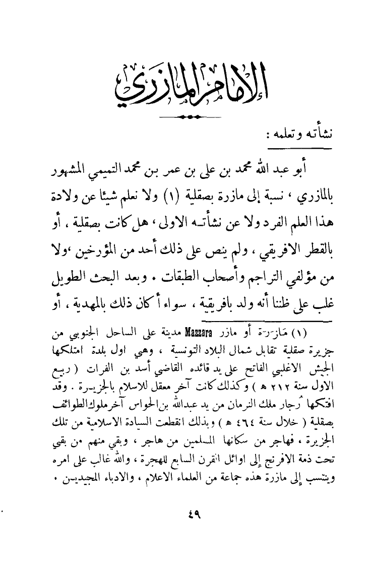 أبو عبد الله محمد بن علي بن عمر بن محمد التميمي المشهور بالمازري، نسبة إلى مازرة بصقلية (¬1) ولا نعلم شيئًا عن ولادة هذا العلم الفرد ولا عن نشأته الأولى، هل كانت بصقلية، أو بالقطر الأفريقي، ولم ينص على ذلك أحد من المؤرخين، ولا من مؤلفي التراجم وأصحاب الطبقات. وبعد البحث الطويل غلب على ظننا أنه ولد بإفريقية، سواء أكان ذلك بالمهدية، أو