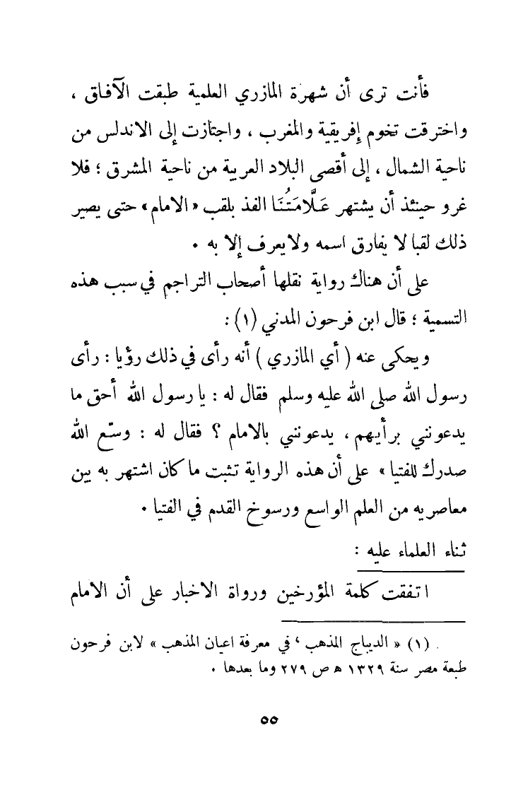 فأنت ترى أن شهرة المازري العلمية طبقت الآفاق، واخترقت تخوم إفريقية والمغرب، واجتازت إلى الأندلس من ناحية الشمال، إلى أقصى البلاد العربية من ناحية المشرق، فلا غرو حينئذٍ أن يشتهر عَلاَّمَتُنَا الفَذُّ بلقب «الإِمَامِ» حتى يصير ذلك لقبًا لا يفارق اسمه ولا يعرف إلا به.