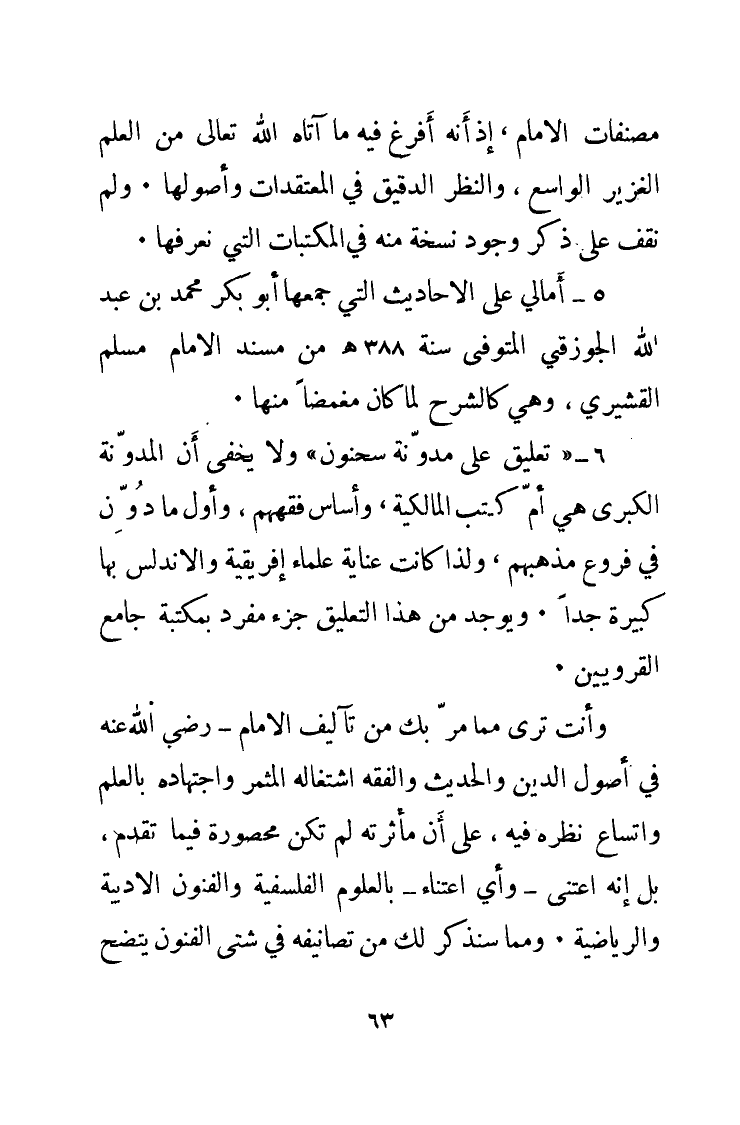 وأنت ترى مِمَّا مَرَّ بك من تآليف الإمام - رَضِيَ اللهُ عَنْهُ - في أصول الدين والحديث والفقه اشتغاله المثمر واجتهاده بالعلم واتساع نظره فيه، على أن مأثرته لم تكن محصورة فيما تقدم، بل إنه اعتنى - وأي اعتناء - بالعلوم الفلسفية والفنون الأدبية والرياضية. ومما سنذكر لك من تصانيفه في شتى الفنون يتضح
