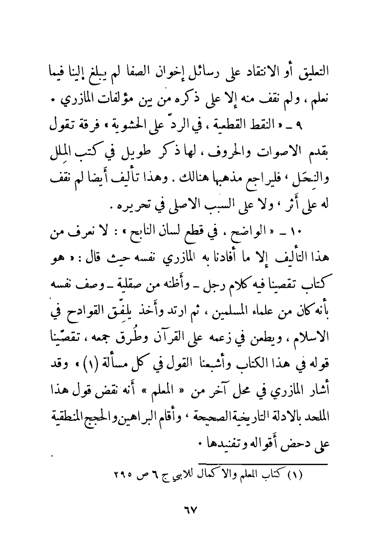 10 - " الواضح في قطع لسان النابح ": لا نعرف من هذا التأليف إلا ما أفادنا به المازري نفسه حيث قال: «هُوَ كِتَابٌ تَقَصَّيْنَا فِيهِ كَلاَمَ رَجُلٍ - وَأَظُنُّهُ مِنْ صِقِلِّيَّةَ - وَصَفَ نَفْسَهُ بِأَنَّهُ كَانَ مِنْ عُلَمَاءِ المُسْلِمِينَ، ثُمَّ ارْتَدَّ وَأَخَذَ يُلَفِّقُ القَوَادِحَ فِي الإِسْلاَمِ، وَيَطْعَنُ فِي زَعْمِهِ عَلَى القُرْآنِ وَطُرُقِ جَمْعِهِ، تَقَصَّيْنَا قَوْلَهُ فِي هَذَا الكِتَابِ وَأَشْبَعْنَا القَوْلَ فِي كُلِّ مَسْأَلَةٍ» (¬1). وقد أشار المازري في محل آخر من " المعلم " أنه نقض قول هذا الملحد بالأدلة التاريخية الصحيحة، وأقام البراهين والحجج المنطقية على دحض أقواله وتفنيدها.