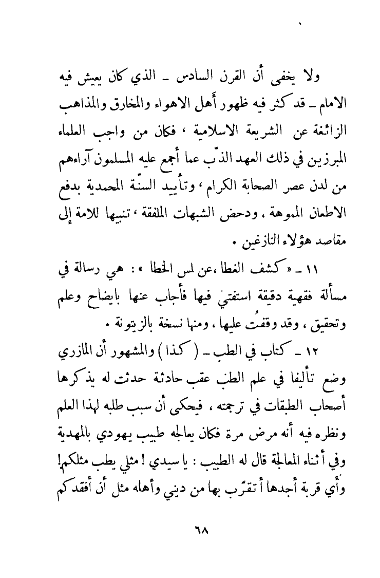 12 - " كتاب في الطب " - (كذا) والمشهور أن المازري وضع تأليفًا في علم الطب عقب حادثة حدثت له يذكرها أصحاب الطبقات في ترجمته فيحكي أن سبب طلبه لهذا العلم ونظره فيها أنه مرض مرة فكان يعالجه طبيب يهودي بالمهدية وفي أثناء المعالجة قال له الطبيب: «يَا سَيِّدِي! مِثْلِي يُطِبُّ مِثْلَكُمْ! وَأَيُّ قُرْبَةٍ أَجِدُهَا أَتَقَرَّبُ بِهَا مِنْ دِينِي وَأَهْلِهِ مِثْلَ أَنْ أَفْقِدَكُمْ