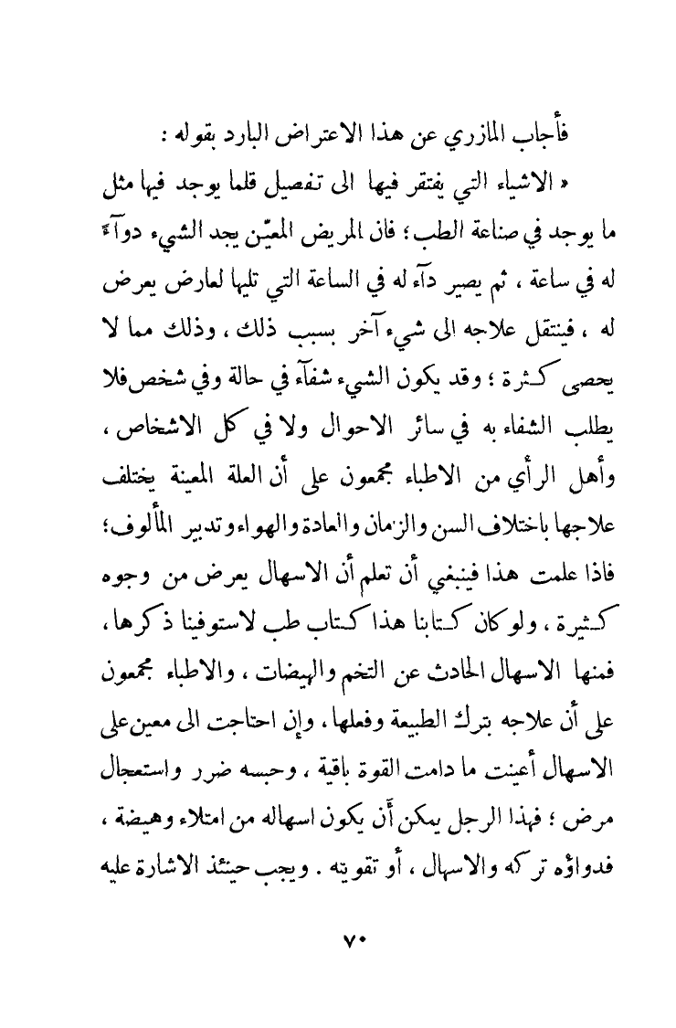 فأجاب المازري عن هذا الاعتراض البارد بقوله: «الأَشْيَاءُ التِي تَفْتَقِرُ فِيهَا إِلَى تَفْصِيلٍ قَلَّمَا يُوجَدُ فِيهَا مِثْلُ مَا يُوجَدُ فِي صِنَاعَةِ الطُّبِّ؛ فَإِنَّ المَرِيضَ المُعَيَّنَ يَجِدُ الشَّيْءَ دَوَاءً لَهُ فِي سَاعَةٍ، ثَمَّ يُصِيرُ دَاءً لَهُ فِي السَّاعَةِ التِي تَلِيهَا لِعَارَضٍ يَعْرِضُ لَهُ، فَيَنْتَقِلُ عِلاَجُهُ إِلَى شَيْءٍ آخر بِسَبَبِ ذَلِكَ، وَذَلِكَ مِمَّا لاَ يُحْصَى كَثْرَةً؛ وَقَدْ يُكُونُ الشَّيْءُ شِفَاءً فِي حالَةٍ وَفِي شَخْصٍ فَلاَ يُطْلَبُ الشِّفَاءُ بِهِ فِي سَائِرِ الأَحْوَالِ وَلاَ فِي كُلِّ الأَشْخَاصِ، وَأَهْلُ الرَّأْيِ مِنَ الأَطِبَّاءِ مُجْمِعُونَ عَلَى أَنَّ العِلَّةَ المُعَيَّنَةَ يَخْتَلِفُ عِلاَجُهَا بِاِخْتِلاَفِ السِّنِّ وَالزَّمَانِ وَالعَادَةِ وَالهَوَاءِ وَتَدْبِيرِ المَأْلُوفِ؛ فَإِذَا عَلِمَتْ هَذَا فَيَنْبَغِي أَنْ تَعْلَمَ أَنَّ الإِسْهَالَ يَعْرِضُ مِنْ وُجُوهٍ كَثِيرَةٍ، وَلَوْ كَانَ كِتَابُنَا هَذَا كِتَابَ طِبٍّ لاسْتَوْفَيْنَا ذِكْرَهَا، فَمِنْهَا الإِسْهَالُ الحادِثُ عَنْ التُّخَمِ وَالهَيْضَاتِ، وَالأَطِبَّاءُ مُجْمِعُونَ عَلَى أَنَّ عِلاَجَهُ بتَرْكِ الطَّبِيعَةِ وَفِعْلِهَا، وَإِنْ اِحْتَاجَتْ إِلَى مُعِينٍ عَلَى الإِسْهَالِ أُعِينَتْ مَا دَامَتْ القُوَّةُ بَاقِيَةً، وَحَسْبُهُ ضَرَرَ وَاِسْتِعْجالَ مَرَضٍ؛ فَهَذَا الرَّجُلُ يُمْكِنُ أَنْ يَكُونَ إِسْهَالُهُ مِنْ اِمْتِلاءٍ وَهَيْضَةٍ، فَدَوَاؤُهُ تَرْكَهُ وَالإِسْهَالَ، أَوْ تَقْوِيَتَهُ. وَيَجِبُ حِينَئِذٍ الإِشَارَةُ عَلَيْهِ