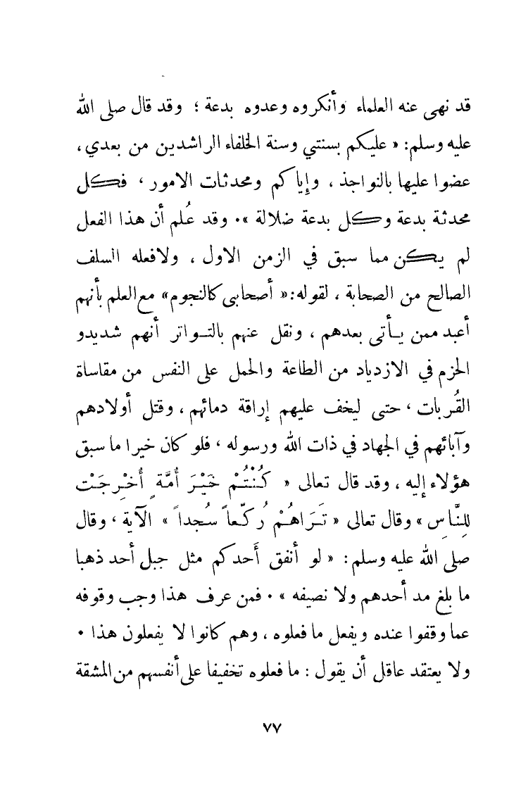 قَدْ نَهَى عَنْهُ العُلَمَاءُ وَأَنْكَرُوهُ وَعَدُّوهُ بِدْعَةً، وَقَدْ قَالَ - صَلَّى اللهُ عَلَيْهِ وَسَلَّمَ -: " عَلَيْكُمْ بِسُنَّتِي، وَسُنَّةِ الخُلَفَاءِ الرَّاشِدِينَ مِنْ بَعْدِي، عَضُّوا عَلَيْهَا بِالنَّوَاجِذِ، وَإِيَّاكُمْ وَمُحْدَثَاتِ الأُمُورِ فَكُلُّ مُحْدَثَةٍ بِدْعَةٌ، وَكُلُّ بِدْعَةٍ ضَلاَلَةٌ ". وَقَدْ عُلِمَ أَنَّ هَذَا الفِعْلَ لَمْ يَكُنْ مِمَّا سَبَقَ فِي الزَّمَنِ الأَوَّلِ، وَلاَ فَعَلَهُ السَّلَفُ الصَّالِحُ مِنَ الصَّحَابَةِ، لِقَوْلِهِ: " أَصْحَابِي كَالنُّجُومِ " (*) مَعَ العِلْمِ بِأَنَّهُمْ أَعْبَدُ مِمَّنْ يَأْتِي بَعْدَهُمْ، وَنُقِلَ عَنْهُمْ بِالتَّوَاتُرِ أَنَّهُمْ شَدِيدُو الحَزْمِ فِي الاِزْدِيَادِ مِنَ الطَّاعَةِ وَالحَمْلِ عَلَى النَّفْسِ مِنْ مُقَاسَاةِ القُرُبَاتِ، حَتَّى لَيَخِفُّ عَلَيْهِمْ إِرَاقَةُ دِمَائِهِمْ، وَقَتْلُ أَوْلاَدِهِمْ وَآبَائِهِمْ فِي الجِهَادِ فِي ذَاتِ اللهِ وَرَسُولِهِ، فَلَوْ كَانَ خَيْرًا مَا سَبِقَ هَؤُلاَءِ إِلَيْهِ، وَقَدْ قَالَ تَعَالَى: {كُنْتُمْ خَيْرَ أُمَّةٍ أُخْرِجَتْ لِلنَّاسِ} [آل عمران: 110]، وَقَالَ تَعَالَى: {تَرَاهُمْ رُكَّعًا سُجَّدًا} [الفتح: 29]، الآيَةُ، وَقَالَ - صَلَّى اللهُ عَلَيْهِ وَسَلَّمَ -: " لَوْ أَنَّ أَحَدَكُمْ أَنْفَقَ مِثْلَ أُحُدٍ، ذَهَبًا مَا بَلَغَ مُدَّ أَحَدِهِمْ، وَلاَ نَصِيفَهُ". فَمَنْ عَرَفَ هَذَا وَجَبَ وُقُوفُهُ عَمَّا وَقَفُوا عِنْدَهُ وَيَفْعَلُ مَا فَعَلُوهُ، وَهُمْ كَانُوا لاَ يَفْعَلُونَ هَذَا. وَلاَ يَعْتَقِدُ عَاقِلٌ أَنْ يَقُولَ: مَا فَعَلُوهُ تَخْفِيفًا عَلَى أَنْفُسِهِمْ مِنَ المَشَقَّةِ
