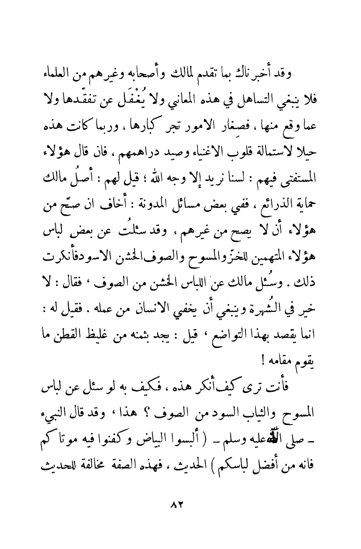 وقد أخبرناك بما تقدم لمالك وأصحابه وغيرهم من العلماء فلا ينبغي التساهل في هذه المعاني وَلاَ يُغْفَلُ عَنْ تَفقُّدِهَا ولا عما وقع منها، فصغار الأمر تجر كبارها، وربما كانت هذه حِيَلاً لاسْتِمَالَةْ قُلُوبِ النَّاسِ وَصَيْدِ دَرَاهِمِهِمْ، فإن قال هؤلاء المُسْتَفْتَى فِيهِمْ: لسنا نريد إلا وجه الله؛ قيل لهم: أصل امال حماية الذارئع، ففي بعض مسائل " المدونة ": أخاف إن صح من هؤلاء أن لا يصح من غيرهم، وقد سئلت عن بعض لباس هؤلاء المتهمين للخز والمسوح والصوف الخشن الأسود فأنكرت ذلك. وَسُئِلَ مَالِكٌ عَنْ لِبَاسِ الصُّوفِ لِلرِّجَالِ فَقَالَ: «لاَ خَيْرَ فِي الشُّهْرَةِ، وَيَنْبَغِي أَنْ يُخْفي الإِنْسَانُ مِنْ عَمَلِهِ». فقيل له: «إِنَّمَا يَقْصِدُ بِهَذَا التَّوَاضُعُ». [قَالَ]: «يَجِدُ بِثَمَنِهِ مِنْ غَلِيظِ القُطْنِ مَا يَقُومُ مَقَامَهُ!» (*).