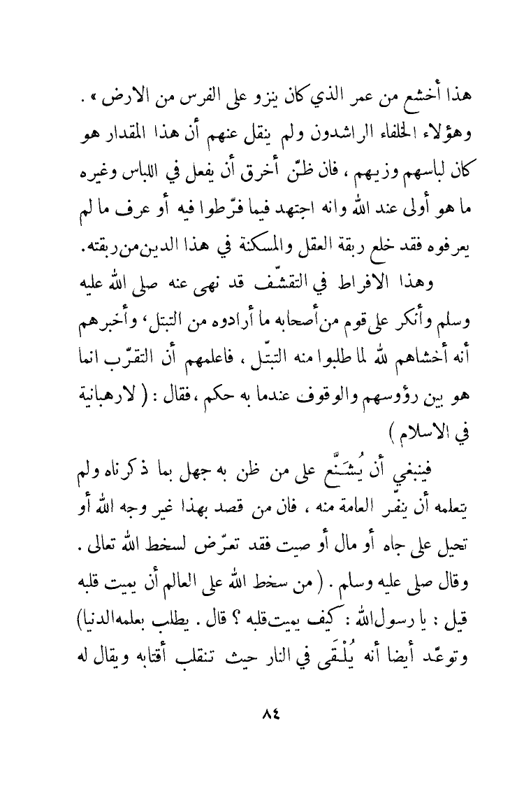 وهذا الإفراط في التقشف قد نهى عنه - صَلَّى اللهُ عَلَيْهِ وَسَلَّمَ - وأنكر على قوم من أصحابه ما أرادوه من التبتل، وأخبرهم أنه أخشاهم للهِ لما طلبوا منه التبتل، فأعلمهم أن التقرب إنما هو بين رؤوسهم والوقوف عندما به حكم، فقال: «لاَ رَهْبَانِيَّةَ فِي الإِسْلامِ».