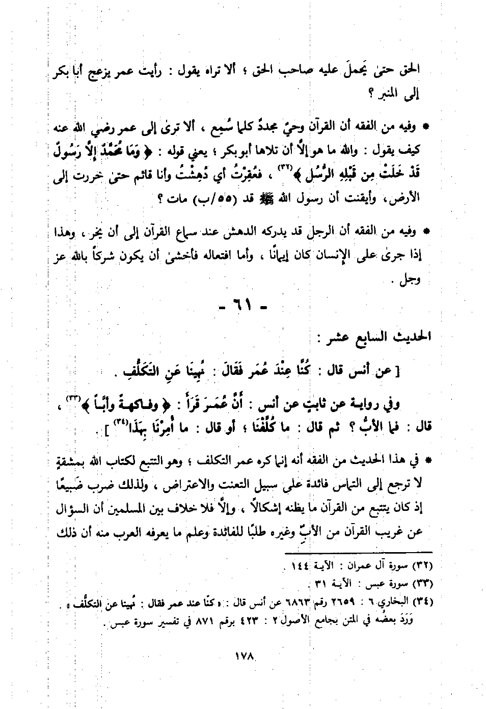 قال المسور: طرقني عبد الرحمن بعد هجع من الليل، فضرب الباب حتى استيقظ فقال: ألا أراك نائما؟ فوالله ما اكتحلت هذه الثلاث بكثير نوم، فادع لي الزبير وسعدًا، فدعوتهما له، فشاورهما، ثم دعاني، فقال: ادع لي عليًا، فدعوته فناجاه حتى إبهار الليل، ثم قام علي من عنده وهو على طمع، وكان عبد الرحمن يخشى من علي شيئًا ثم قال: ادع لي عثمان، فناجاه حتى فرق بينهما المؤذن للصبح، فلما صلى الناس الصبح، اجتمع أولئك الرهط عند المنبر، فأرسل عبد الرحمن (53/ أ) إلى ما كان خارجًا من المهاجرين والأنصار، وأرسل إلى أمراء الأجناد، وكانوا قد وافوا تلك الحجة مع عمر، فلما اجتمعوا تشهد عبد الرحمن وقال: أما بعد، يا علي فإني نظرت في أمر الناس فلم أرهم يعدلون بعثمان، فلا تجعلن على نفسك سبيلا، وأخذ بيد عثمان فقال: أبايعك على سنة الله ورسوله والخليفتين من بعده، فبايعه عبد الرحمن، وبايعه الناس والمهاجرون والأنصار وأمراء الأجناد والمسلمون)].