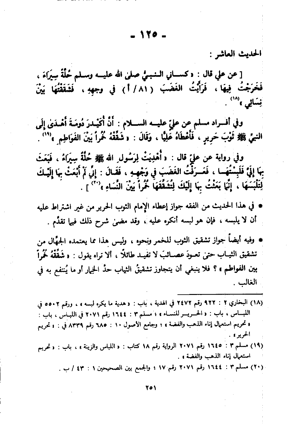 [عن الحسين بن علي أن عليًا رضي الله عنه قال: كانت لي شارف من نصيبي من المغنم يوم بدر، وكان رسول الله - صلى الله عليه وسلم -: أعطاني شارفصا من الخمس يومئذ، فلما أردت أن أبتني بفاطمة بنت رسول الله - صلى الله عليه وسلم - وعدت رجلا صواغًا من بني قينقعا يرتحل معي، فنأتي بإذخر أردت أن أبيعه من الصواغين، فأستعين به في وليمة عرسي، فبينما أنا أجمع لشارفي متاعًا من الأقتاب والغرائر والحبال، وشارفاي مناخان إلى جنب حجرة رجل من الأنصار، أقبلت حين جمعت ما جمعت، فإذا شارفاي قد اجتبت أسنمتهما، وبقرت خواصرهما وأخذ من أكبادهما، فلم أملك عيني حين رأيت ذلك المنظر، فقلت: من فعل هذا؟ قالوا: فعله حمزة، وهو في هذا البيت في شرب من الأنصار، غنته قينة وأصحابه؛ فقالت في غنائها: (ألا يا حمز للشرف النواء ..)، فوثب حمزة إلى السيف، فاجتنب أسنمتهما، وبقر خواصرهما، وأخذ من أكبادهما. قال علي: فانطلقت حتى أدخل على رسول الله - صلى الله عليه وسلم - وعنده زيد بن حارثة، قال: فعرف رسول الله - صلى الله عليه وسلم - في وجهي الذي لقيت، فقال: (79/ أ) (مالك)؟ فقتل: يا رسول الله ما رأيت كاليوم، عدا حمزة على ناقتي فاجتب أسنمتهما، وبقر خواصرهما، وها هو في بيت معه شرب، فدعا رسول الله - صلى الله عليه وسلم - بردائه، فارتداه ثم انطلق يمشي، واتبعته أنا وزيد بن حارثة، حتى جاء البيت الذي فيه حمزة، فاستأذن فأذن له، فإذا هم شرب، فطفق رسول الله - صلى الله عليه وسلم - يلوم حمزة فيما فعل، فإذا حمزة ثمل محمرة عيناه، فنظر إلى رسول الله - صلى الله عليه وسلم - فصعد النظر إلى ركبتيه، ثم صعد النظر فنظر إلى سرته، ثم صعد النظر فنظر إلى وجهه، ثم قال حمزة: وهل أنتم إلا عبيد لأبي؟ فعرف رسول الله - صلى الله عليه وسلم - أنه ثمل، فنكص رسول الله - صلى الله عليه وسلم - على عقبيه