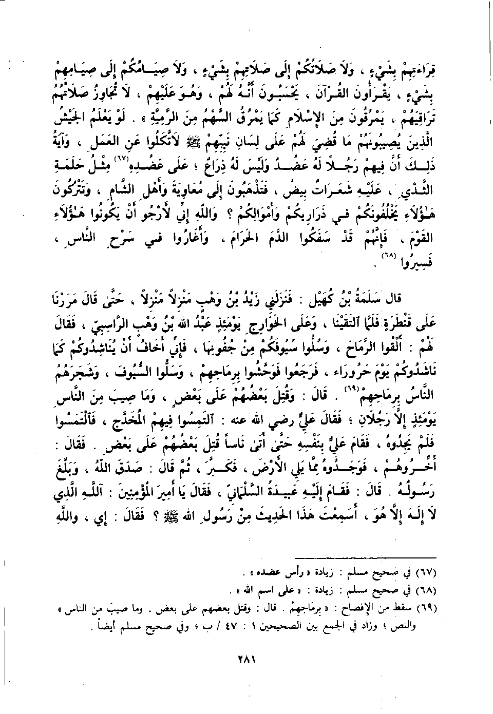 [عن أبي الطفيل قال: (كنت عند علي بن أبي طالب، فأتاه رجل فقال: ما كان النبي - صلى الله عليه وسلم - يسر إليك؟ قال: فغضب ثم قال: ما كان النبي - صلى الله عليه وسلم - يسر إلى شيئًا يكتمه عن الناس، غير أنه قد حدثني بكلمات أربع. قال: ما هن يا أمير المؤمنين؟ قال: قال: (لعن الله من لعن والديه، ولعن الله من ذبح لغير الله، ولعن الله من آوى محدثًا، ولعن الله من غير منار الأرض)].