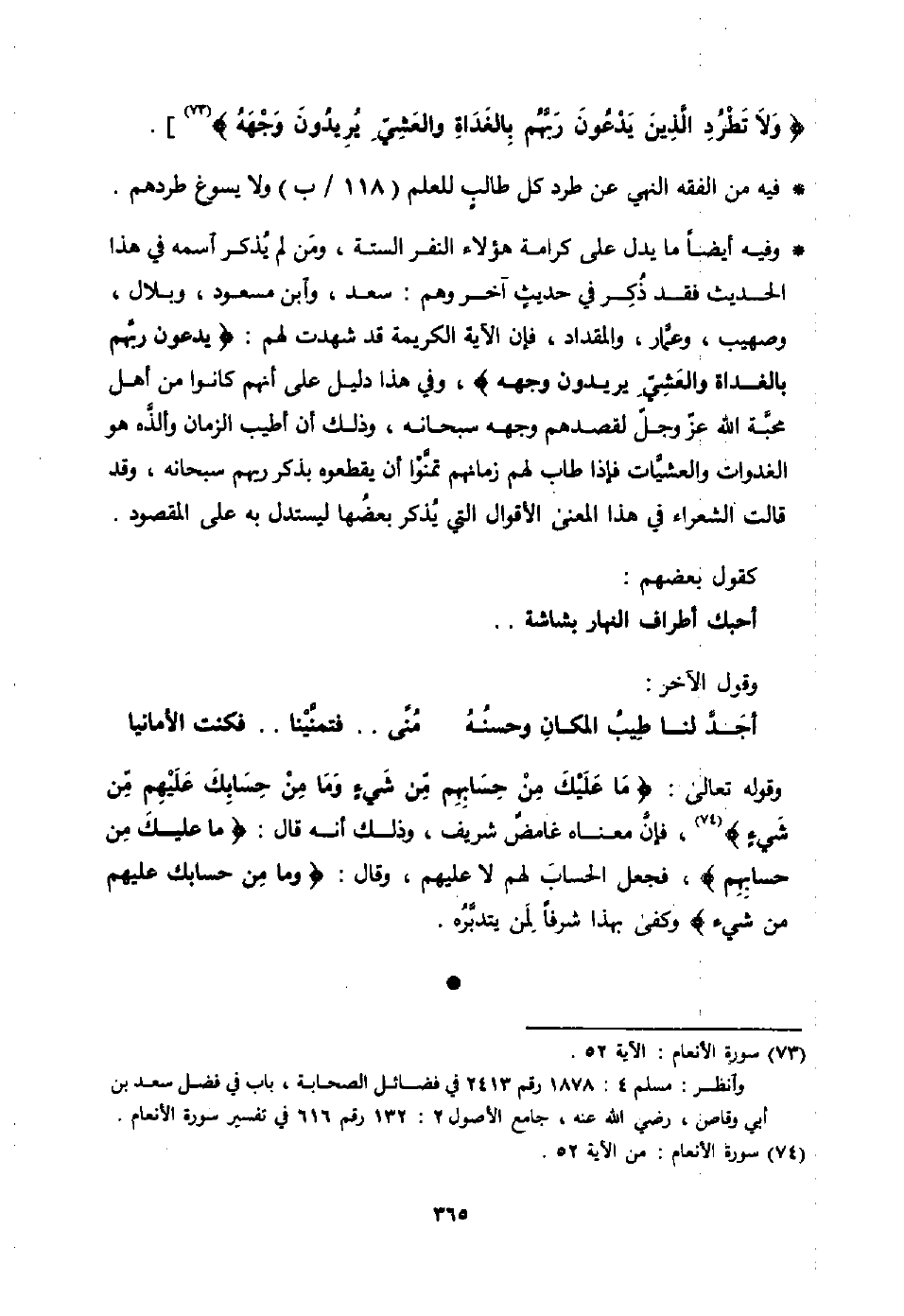 [عن سعد قال: أنزلت في أربع آيات من القرآن. قال: حلفت أم سعد ألا تكلمه حتى يكفر بدينه، ولا تأكل ولا تشر ب؛ قالت: زعمت أن الله وصاك بوالديك، فأنا أمك، وأنا أمرك بهذا، قال: مكثت ثلاثًا حتى غشي عليها من الجهد، فقام ابن لها يقال له عمارة فسقاها، فجعلت تدعو على سعد، فأنزل الله تعالى في القرآن هذه الآية: {ووصينا الإنسان بوالديه حسنًا، وإن جاهداك على أن تشرك بي ما ليس لك به علم فلا تطعهما- وصاحبهما في الدنيا معروفًا}. وقال: وأصاب رسول الله - صلى الله عليه وسلم - غنيمة